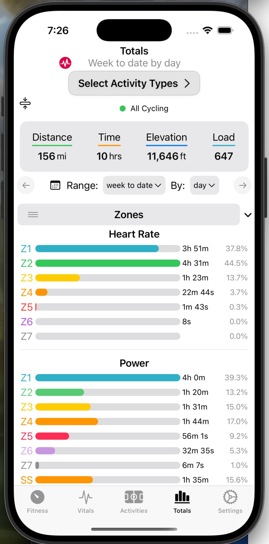 - Time in zone 1,2,3,4 (higher in app)