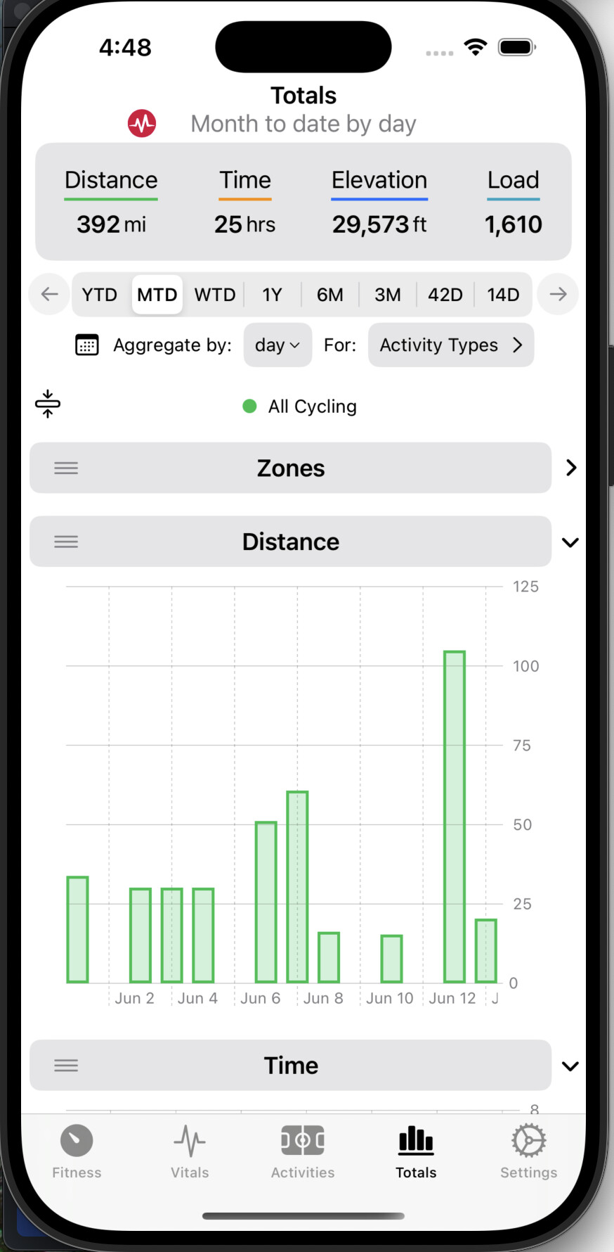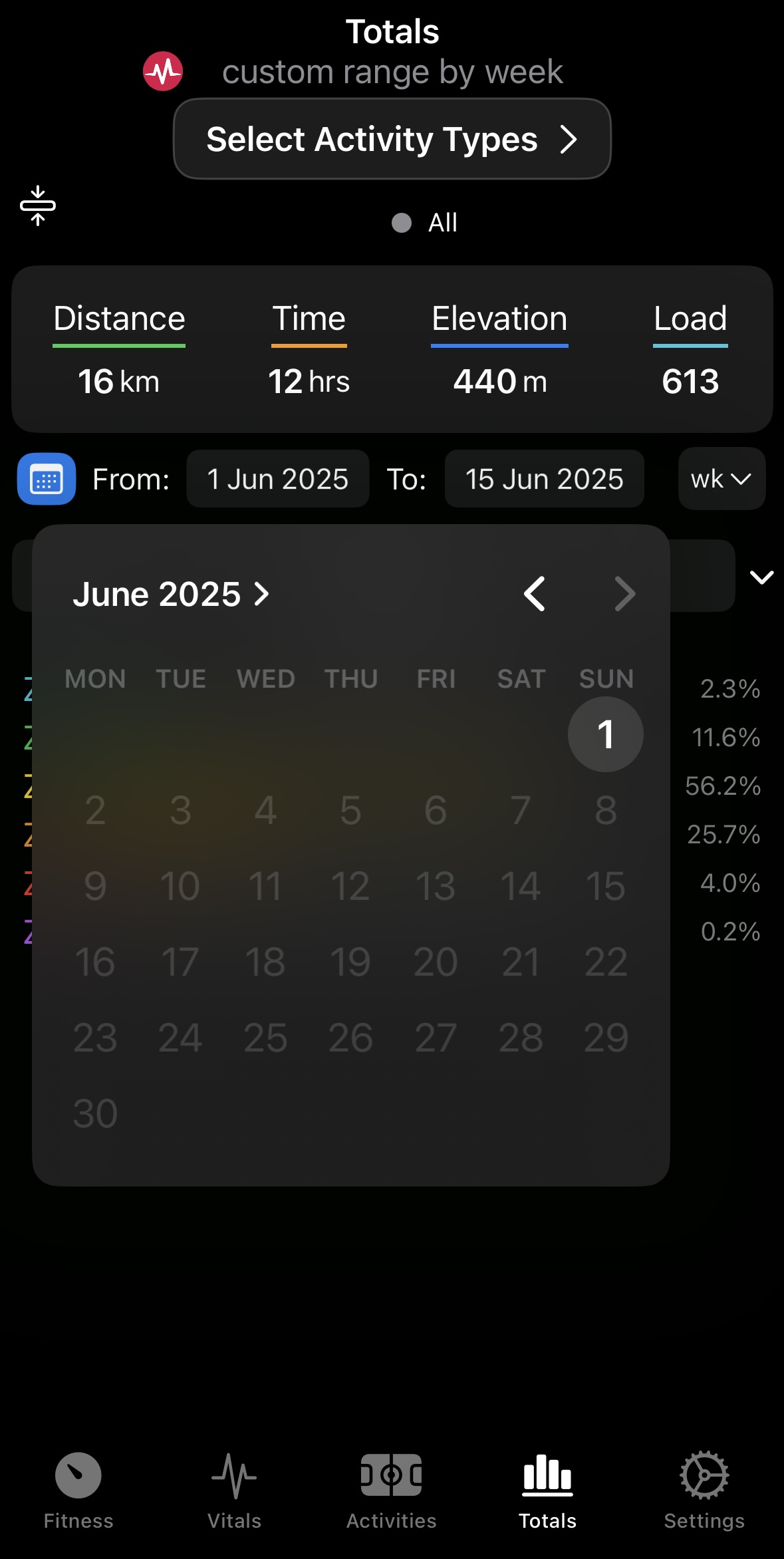 I think intervals.icu handles the number of days in a ‘month’ in a similar way. For example, ‘1 month’ = 30 days, as opposed to e.g. 15 May to 14 June. But in intervals.icu, the number of days you select is the number of days data you get (e.g. if you were to select 7D, you get data from 7 days, not 8), and it includes today. I think it is more intuitive that way, and would be great if the app matched it.