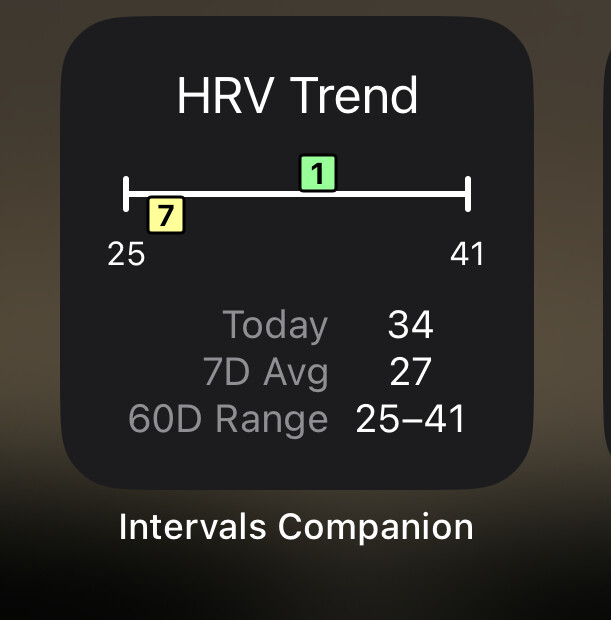 The graphic shows the 60 day HRV average as a range +/- the standard deviation. The current day and 7 day average HRV is shown within the range as colored squares.
