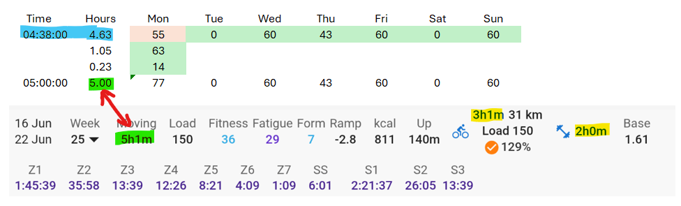 I did an unplanned ride (commute) of 14 minutes, load 22, which when included into the weekly total makes the load almost correct but the duration isn’t.