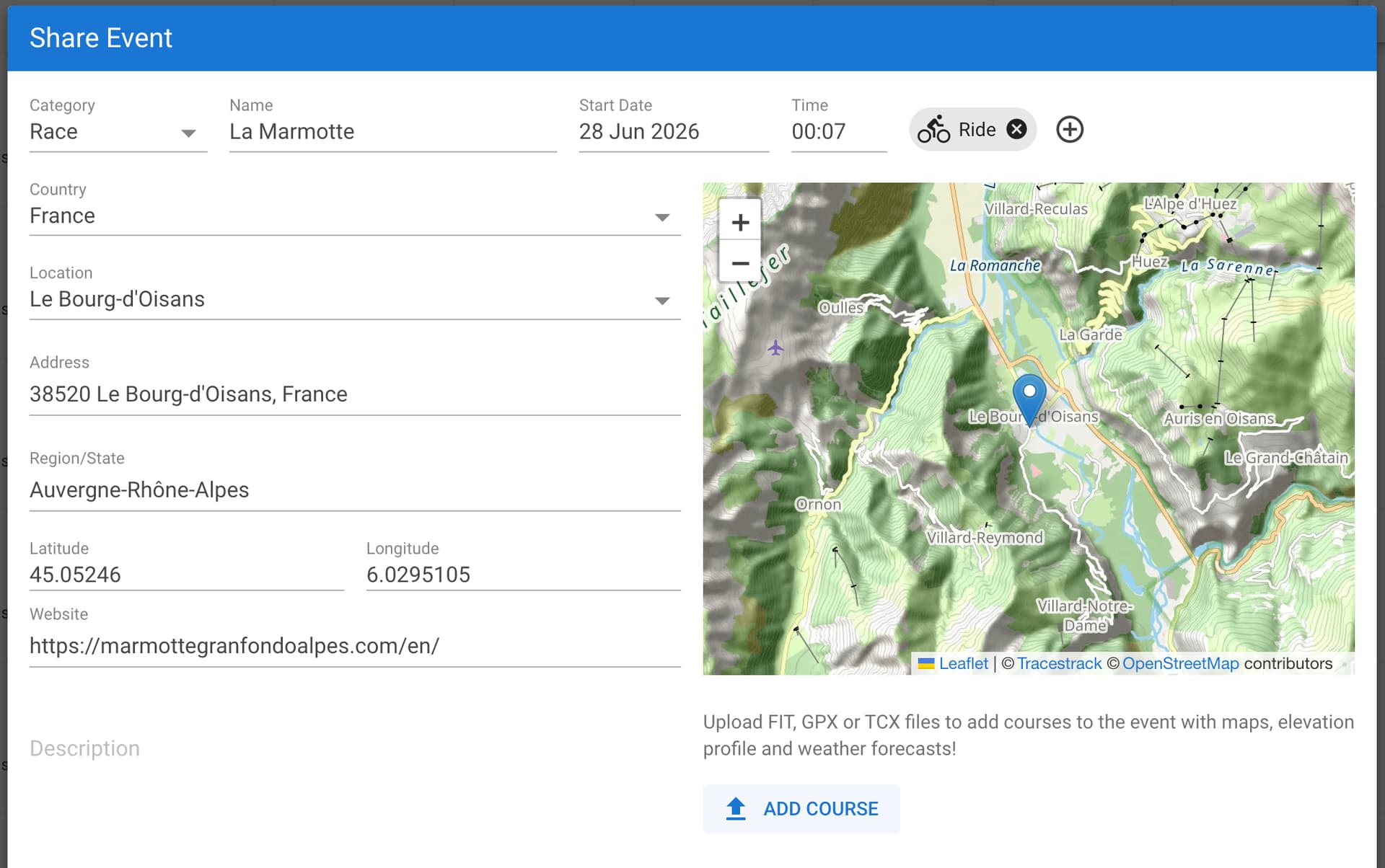 You can now add courses to shared events and races (tx @ryandev!). Edit the event and use the “Add Course” button to upload a FIT, TCX or GPX file: