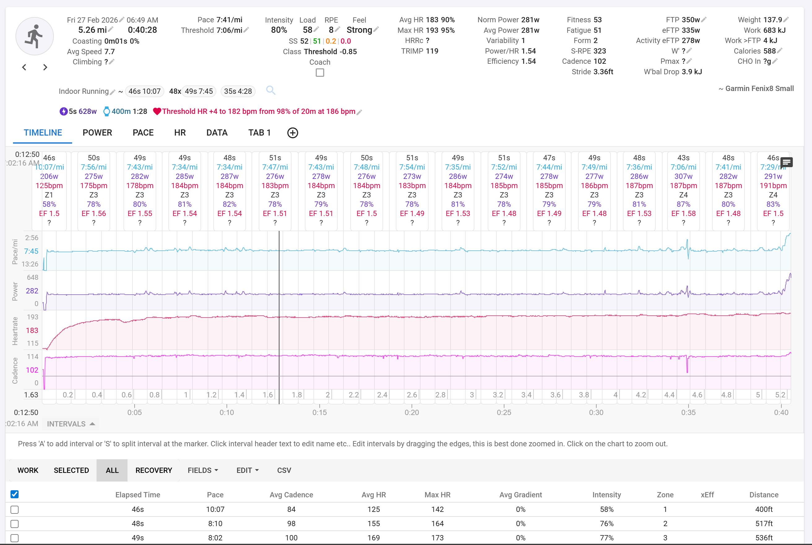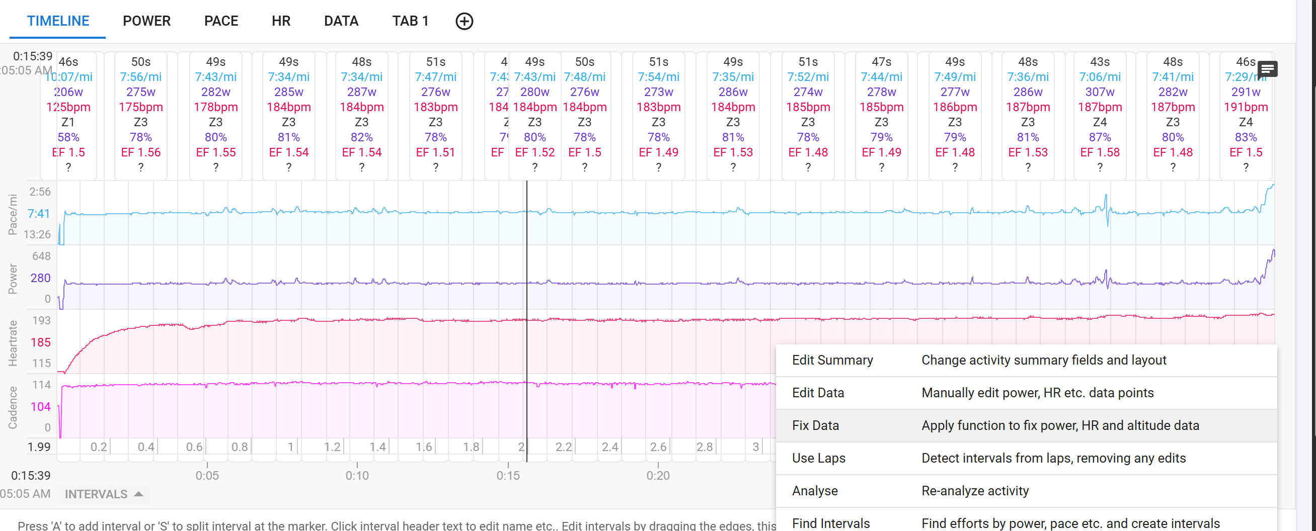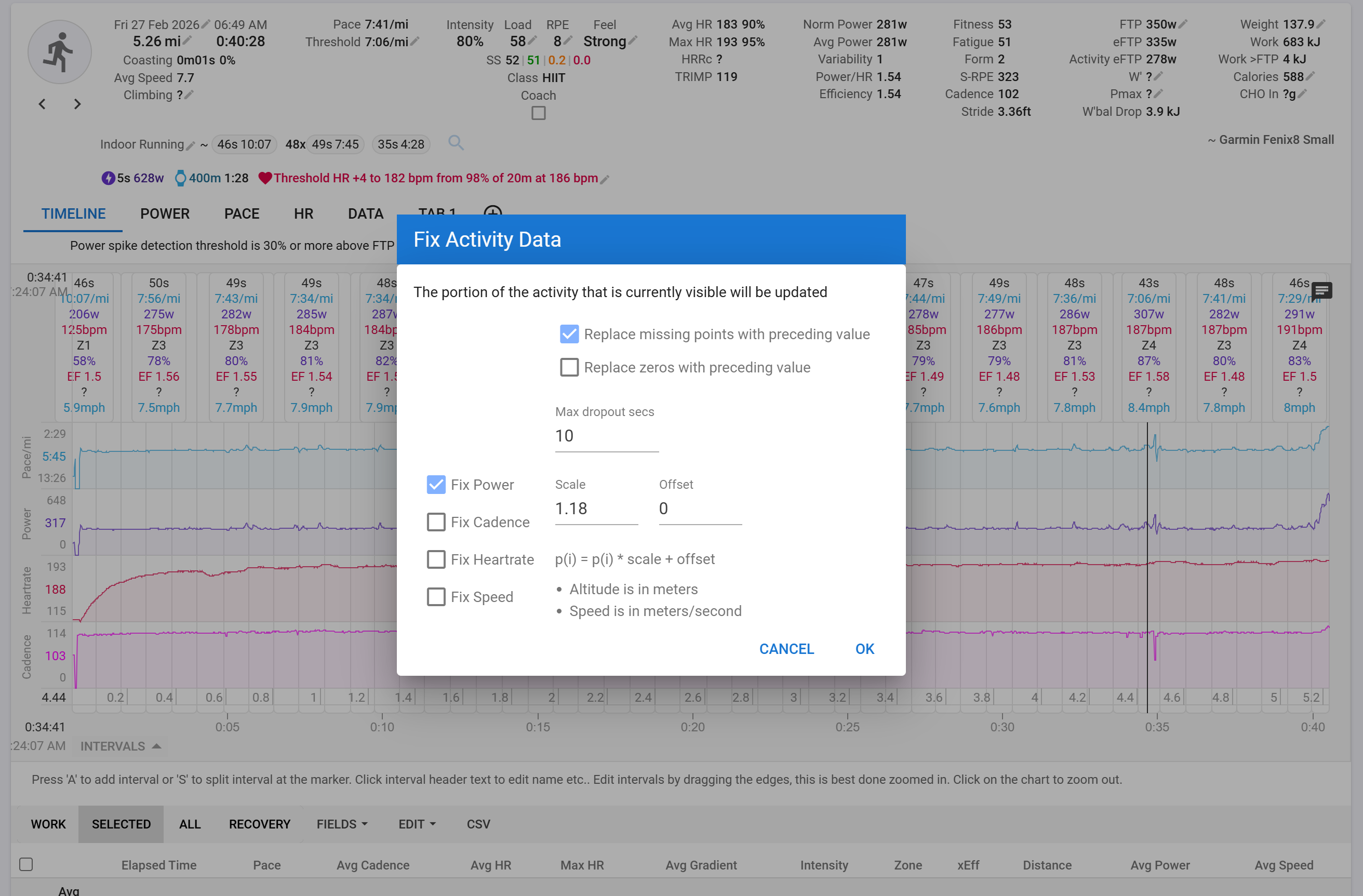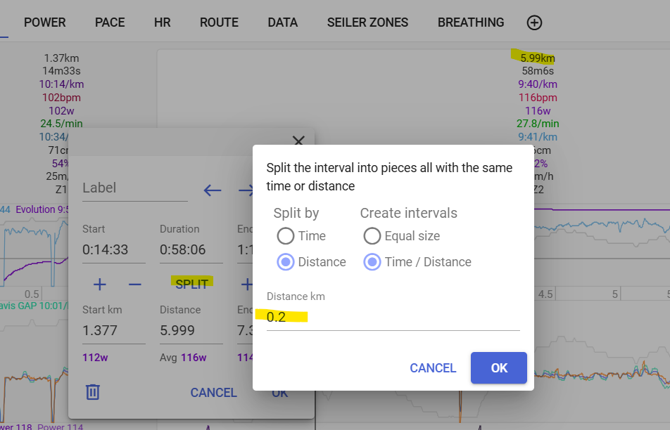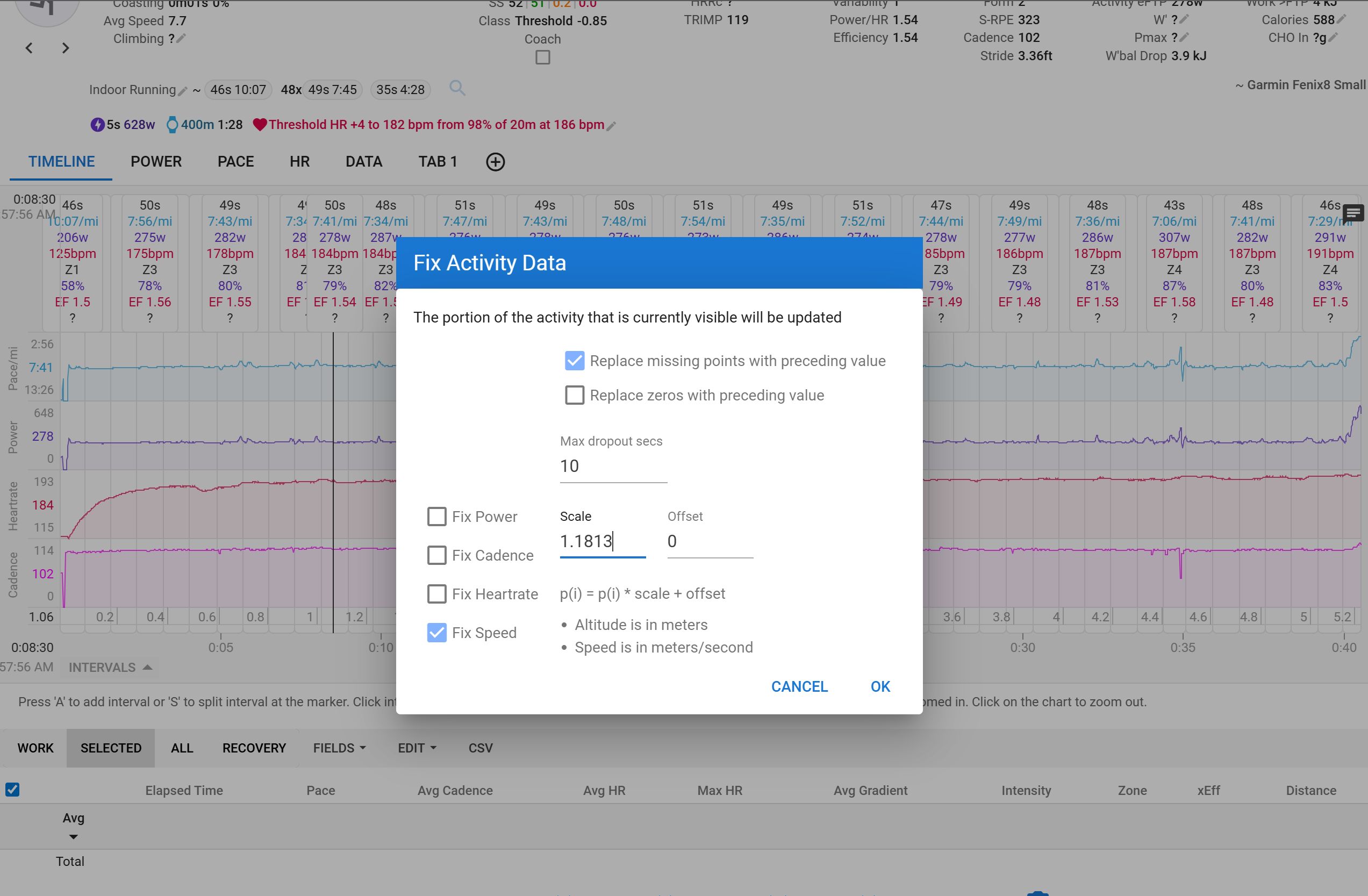 What I want to do is individually remap each interval’s distance value to the desired distance (200m/0.124mi) while leaving the duration of the lap correct.