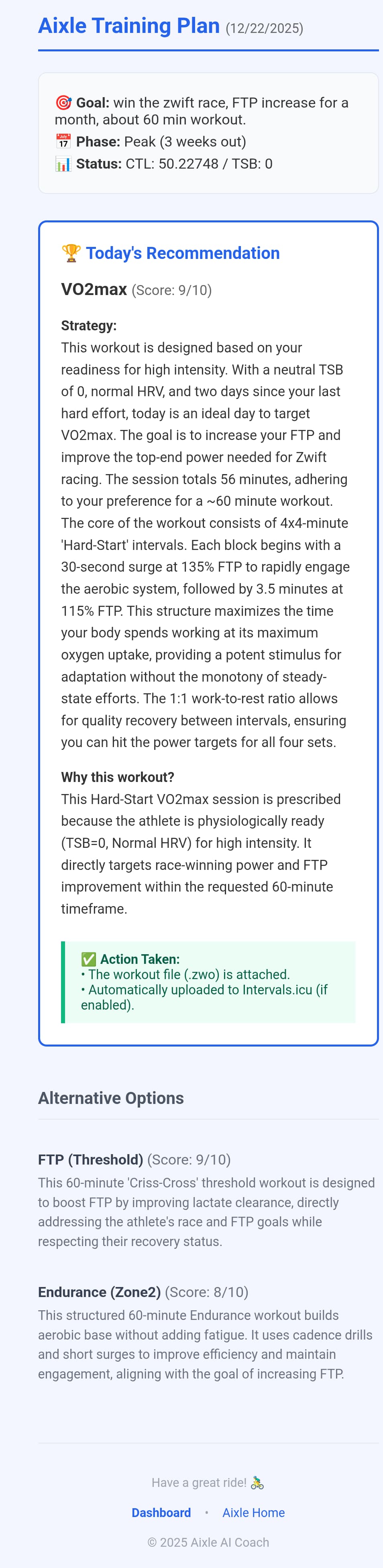 It analyzes your current HRV trends, TSB (Form), and Power Profile from Intervals.icu to provide a Coach’s Score for each. This tells you exactly which session is most recommended for your current physiological state, while giving you the flexibility to choose based on your schedule.