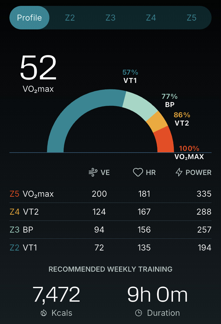 Very interesting. Does Vo2max 52 correlate with your score? Does the app also show the recommended time distribution in the intensity zones (VT1/VT2)?