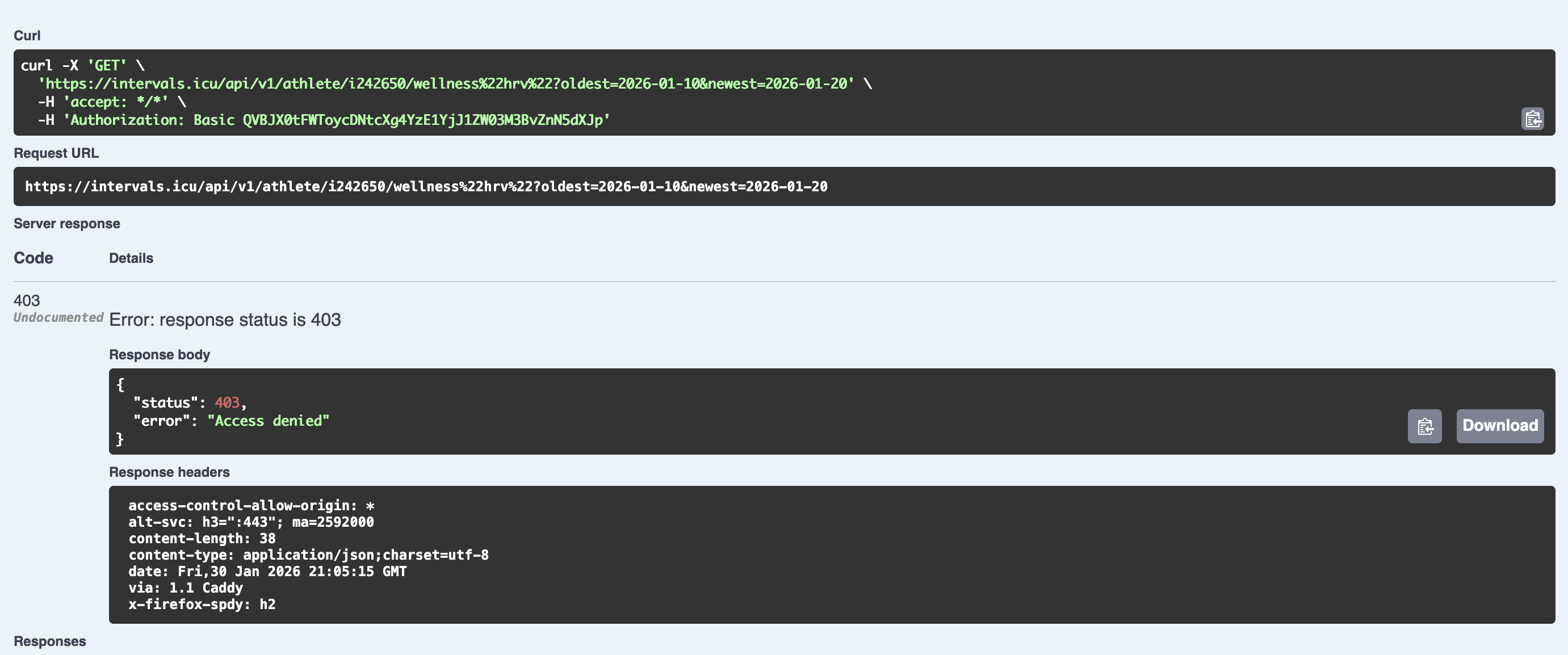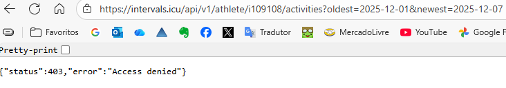 I’m trying to access my own athlete data via API using Basic Auth (API_KEY:my_key), endpoint https://intervals.icu/api/v1/athlete/109108/activities?oldest=2025-12-01&newest=2025-12-07