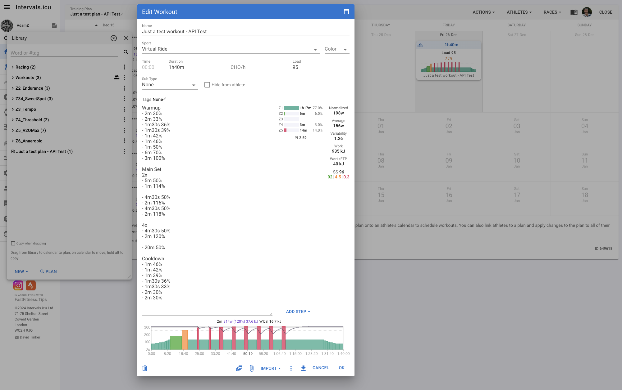 When creating a workout in a library plan via the API (POST /api/v1/athlete/{id}/workouts), the workout structure displayed in the UI is incorrect. It appears to be cached/reused from a previously deleted workout, despite the API returning the correct description and calculated values.