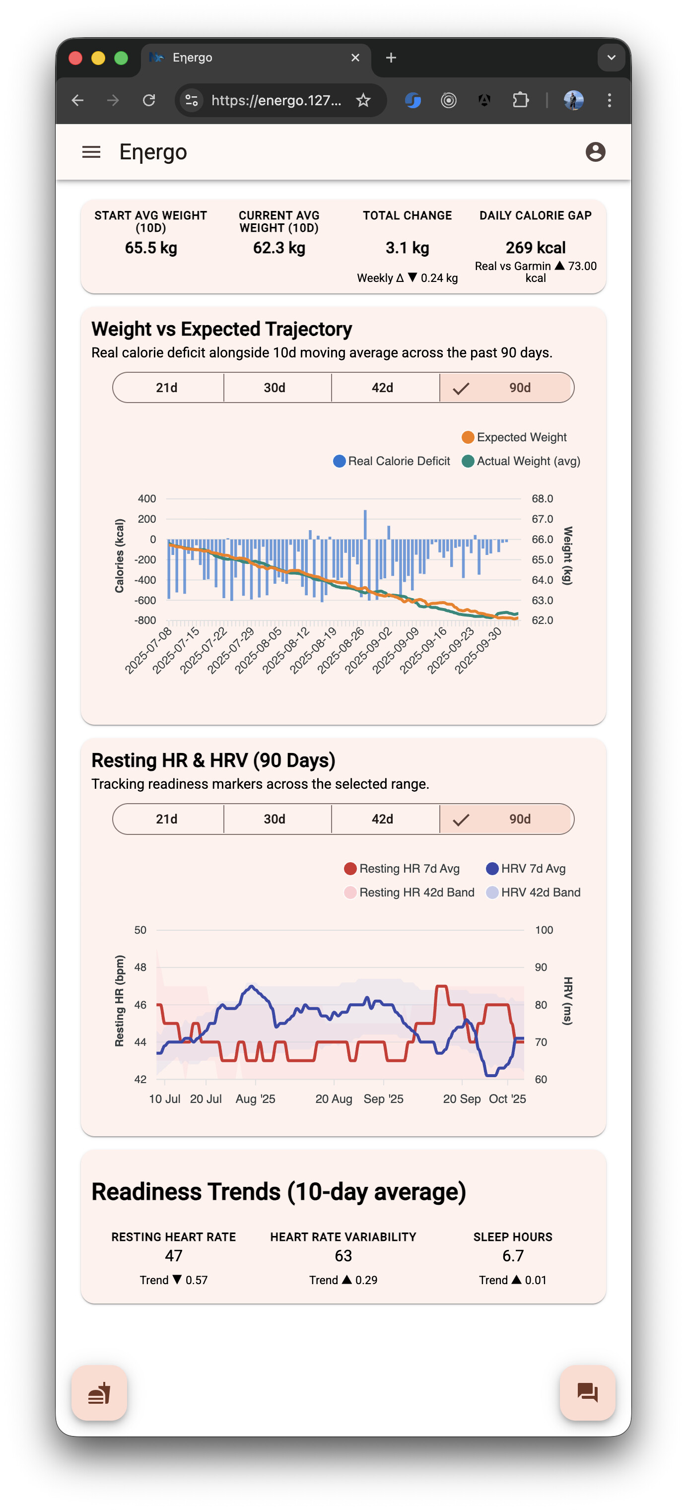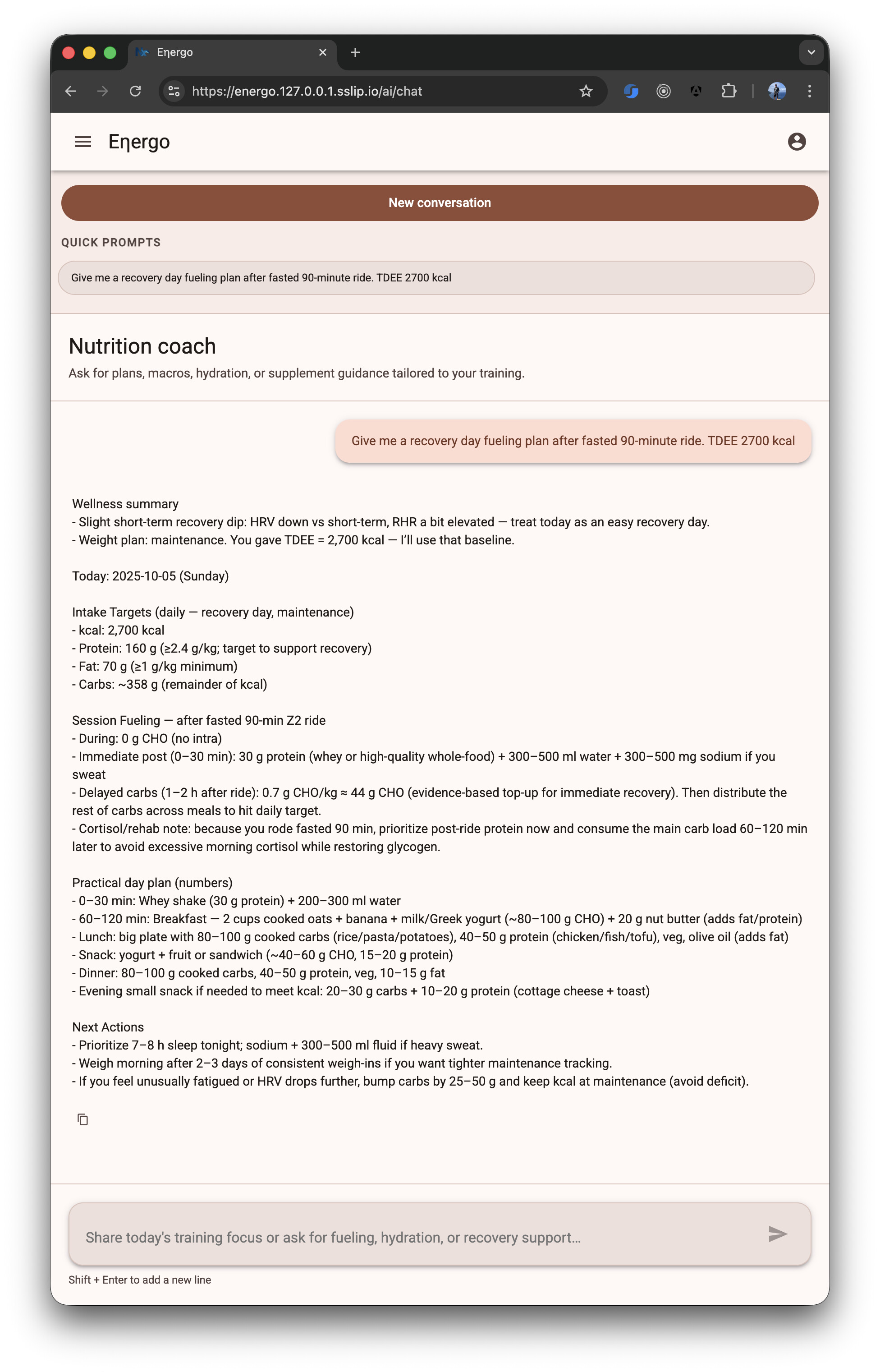 Since I tested it successfully on myself - I decided to build full-fledged app out of it - so that it’s no longer using customGPT, but rather preprocessed context from intervals.icu and calories intake - inside of the same app, which gives a lot more possibilities also for the future (like tracking hard sessions which were under fueled, high difference between expected and measured daily weight, etc.).
