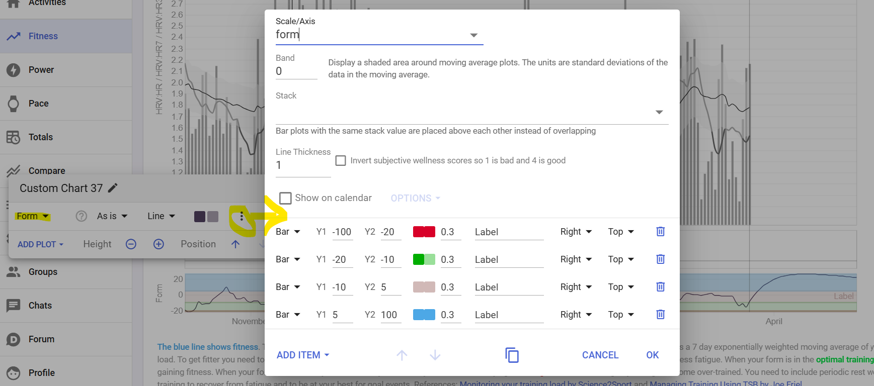 Is there a way to change the TSB bands so that “red zone” happened at say -20 form or -18 or similar. If not, any way to add a reference line to a custom chart in fitness