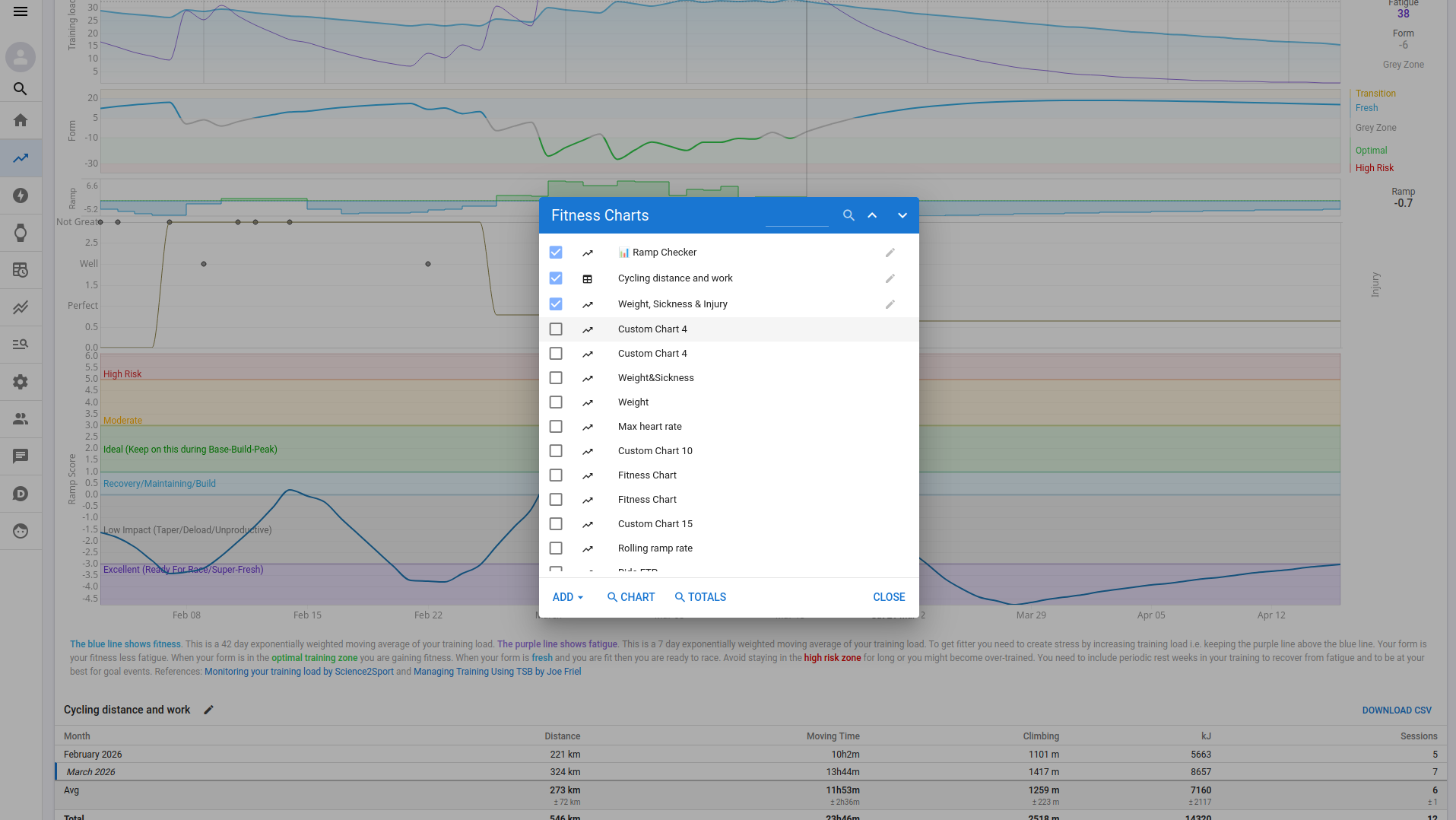 The Ramp Checker chart should be at the top, followed by the Cycling Distance and Work table. At the bottom should be the chart showing Weight, Sickness & Illness.