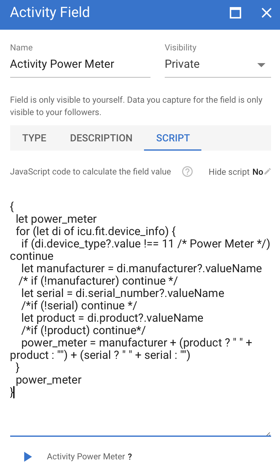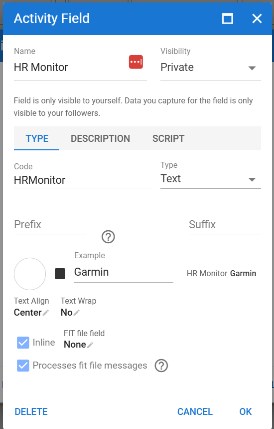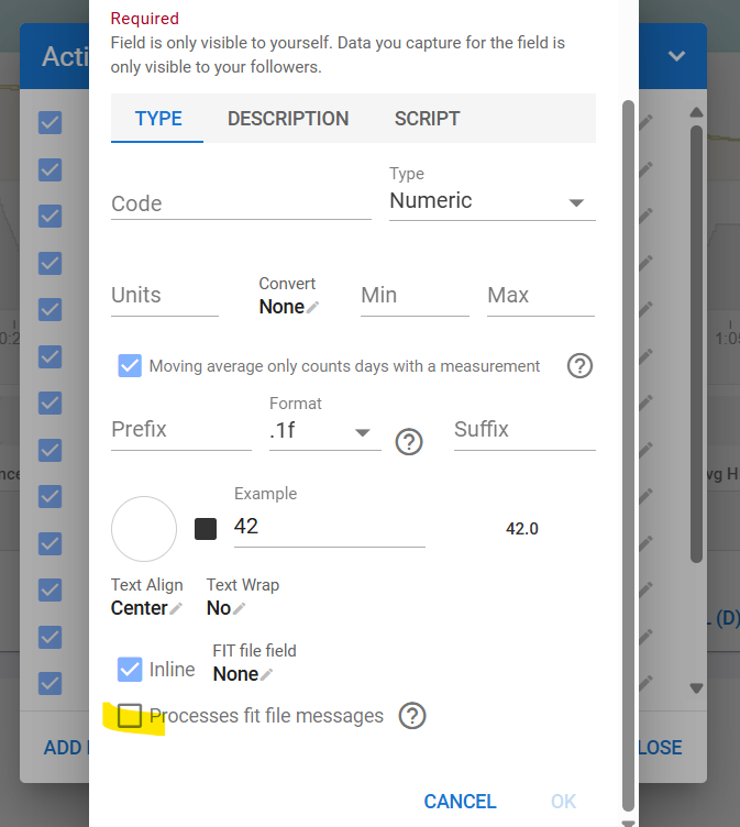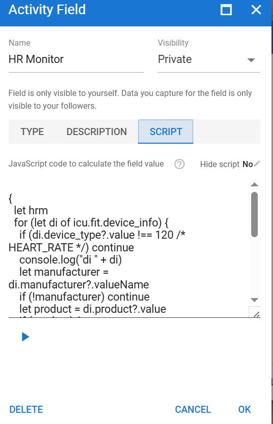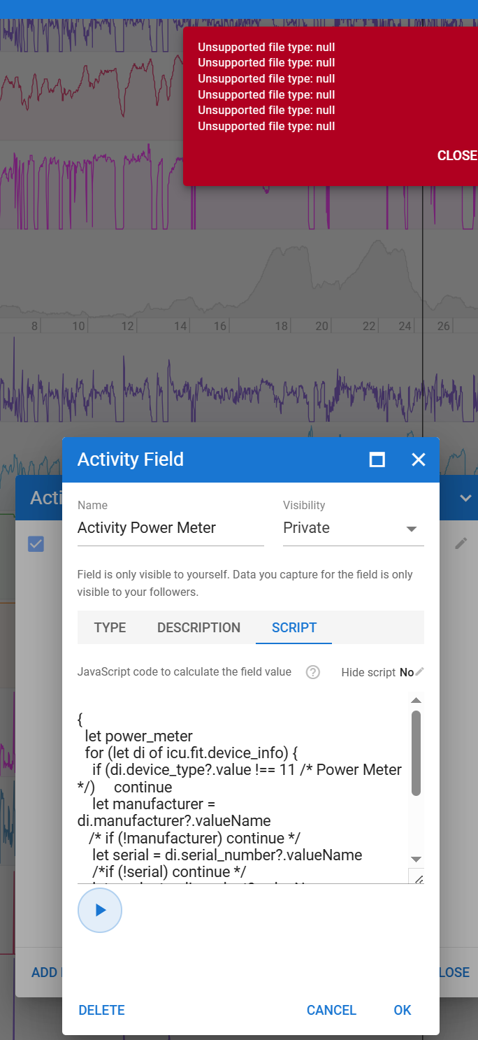 Iāve been trying to set up any of the existing Z2runXX custom activity fields, but none work (they all give me the same TypeError: Cannot read property ādataā from null message when I try to run a preview for the script page). @MedTechCD, any idea of what could be wrong? I tried out re-analysing the activity, using bigger ranges, lowering the minimum number of point threshold, and so on without successā¦).