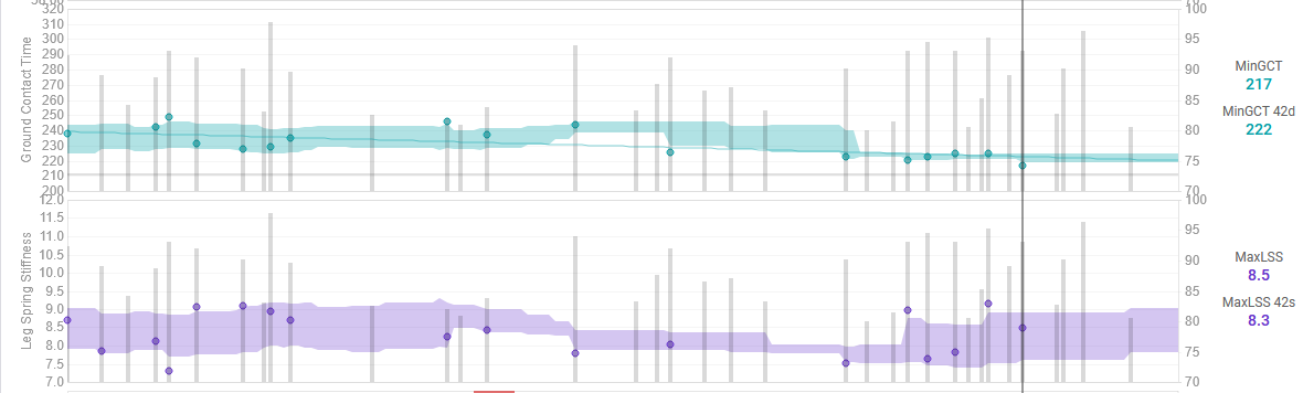 Min GCT and Max LSS are useful for short-term adaptations assessment but are prone to sensor noise and outliers, and are not elicited at threshold intensity. A more robust method to calculate these “peak” metrics is to first compute the Average GCT and LSS for short, high-intensity intervals —such as 200m repeats—filtered for stable grade and air-power, and a minimum pace at or faster than VO2max. The minimum value from these interval averages then becomes your “Min GCT,” and the maximum value your “Max LSS.”