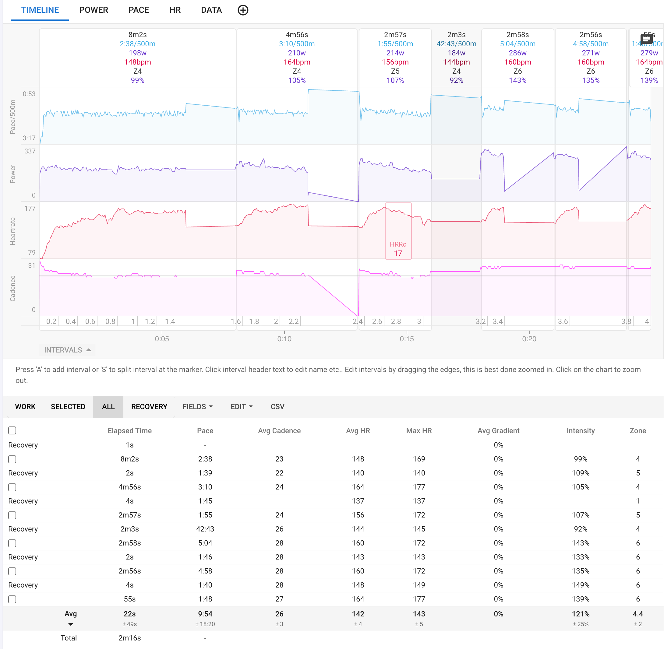 When importing Concept2 RowErg .fit files into Intervals.icu, the workout’s work/rest intervals are already explicitly defined in the FIT “lap” messages, including lap.intensity = active (work) vs rest (recovery). Intervals.icu appears to ignore these lap boundaries / intensities and clumps recovery time into the adjacent work intervals, producing incorrect interval metrics and summaries.