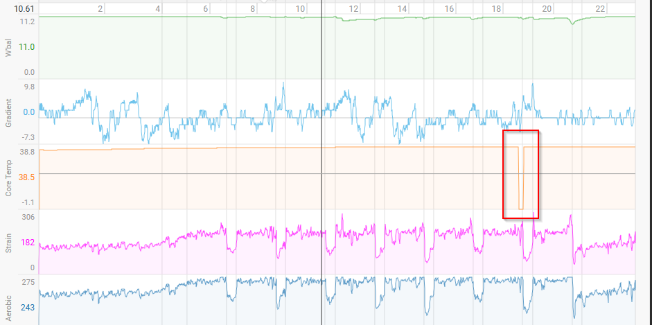 We have implemented a fix for this, replacing the zero values for core and skin temp with null. If the gap is less than 30 seconds then it will be filled in with the last good value, otherwise it is left alone. In your case you still get a dip in the chart but the null doesn’t influence the axis range calculation.