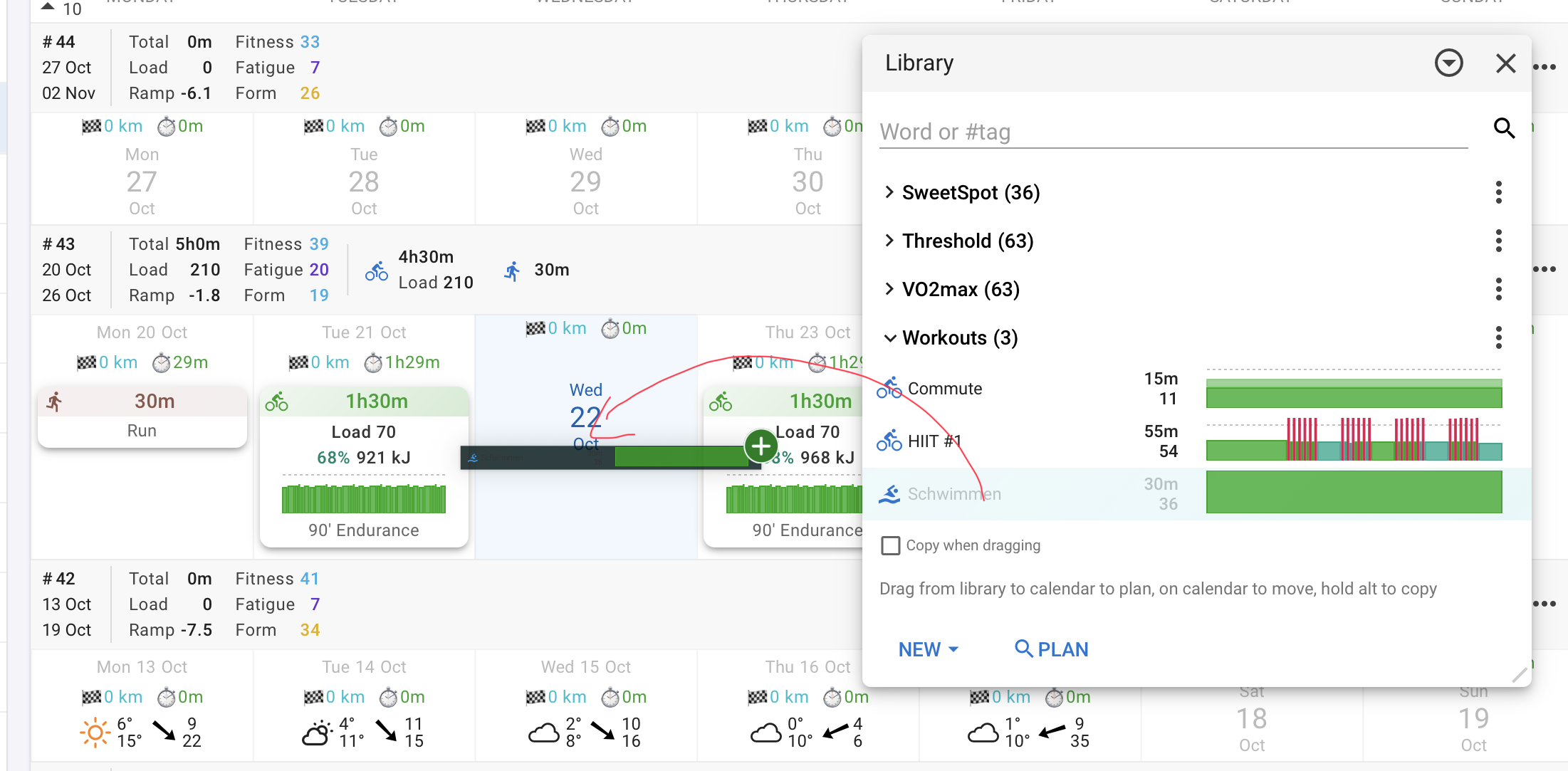 If you have planned for example 1 week, you can then drag and drop that plan to any week in the calendar view from your library.