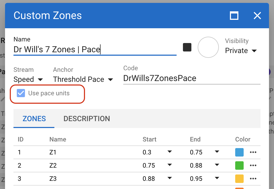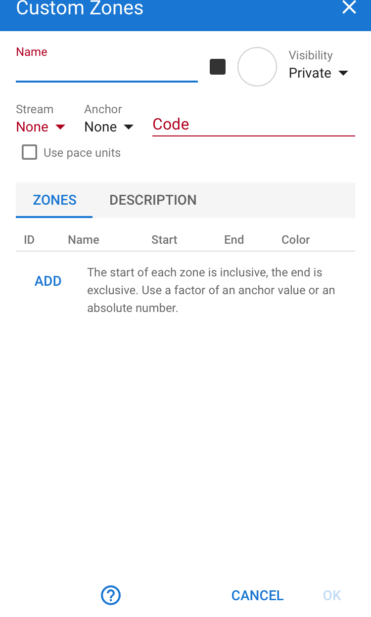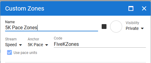 Add a name, code will be auto filled, and select the stream (= zone metric, like power, or heartrate or whatever you want)