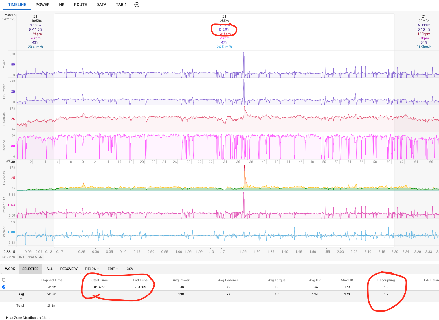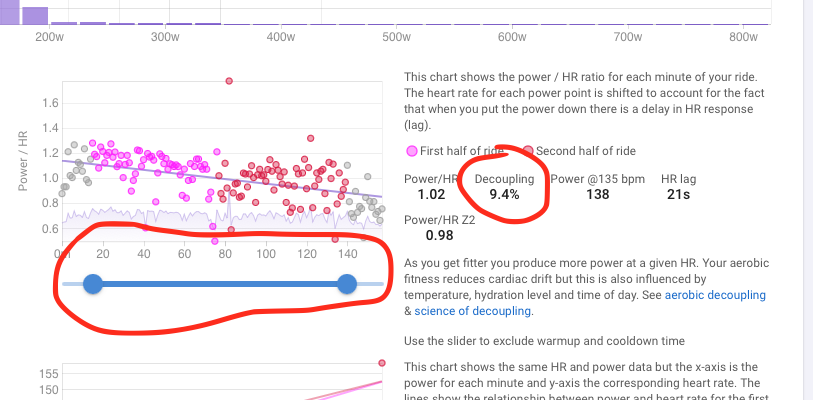 I want to calculate decoupling for a given workout interval (start: 15m, end: 140m). The decoupling calculated for the given interval at the “Timeline” tab (5.9% in the example) is not the same with the decoupling calculated at the “Power” tab after defining the desired interval with the slider.
