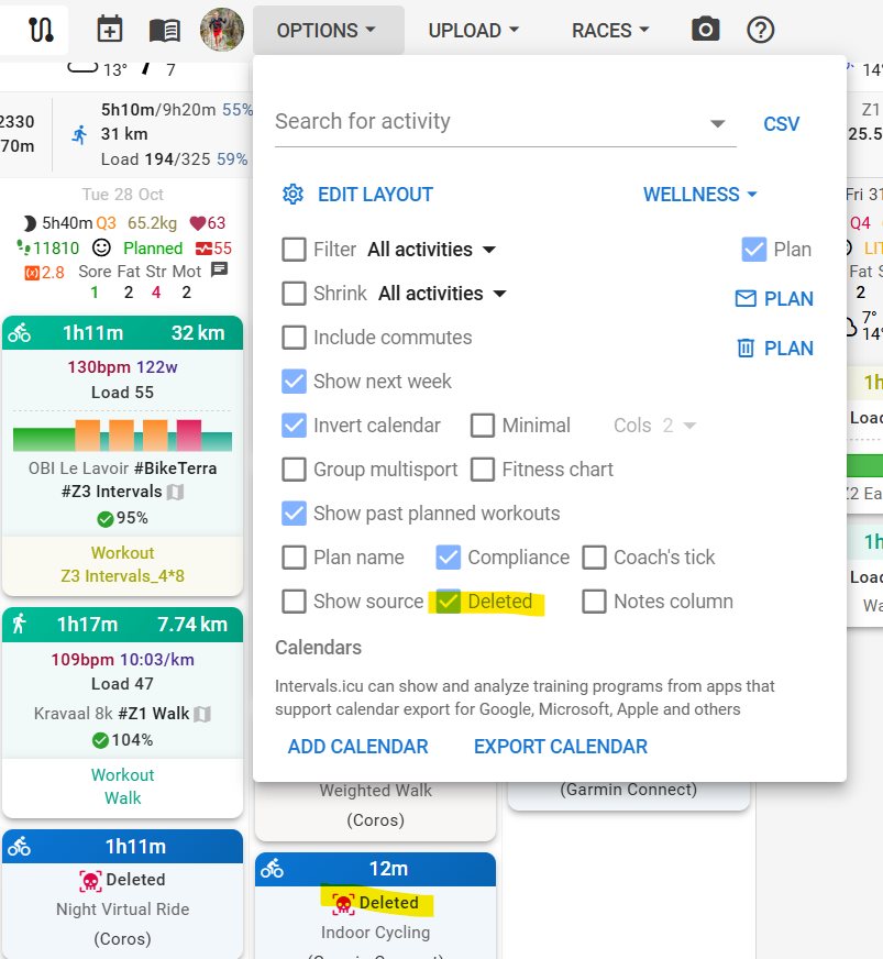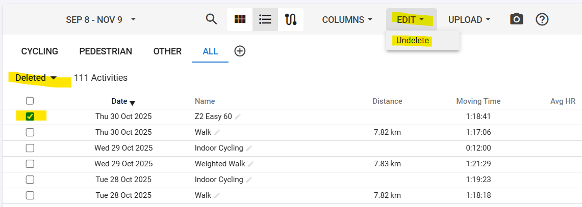 As @MedTechCD said and you can also click “Options” on the calendar page and tick “Show deleted activities”. Then just click on the one you want to undelete. Intervals.icu has to keep track of them to avoid deleted activities coming back as part of the usual Strava/Garmin sync process.