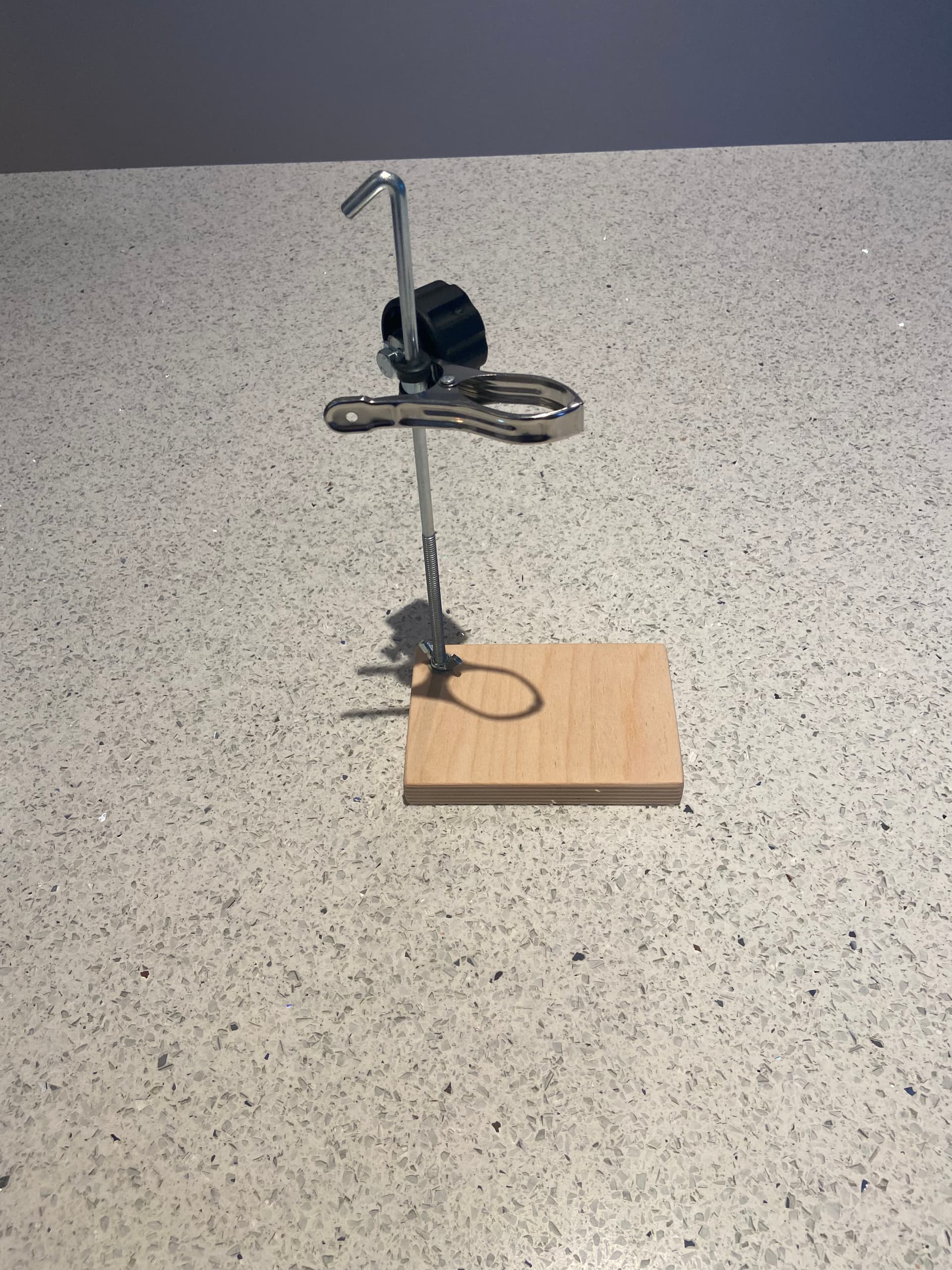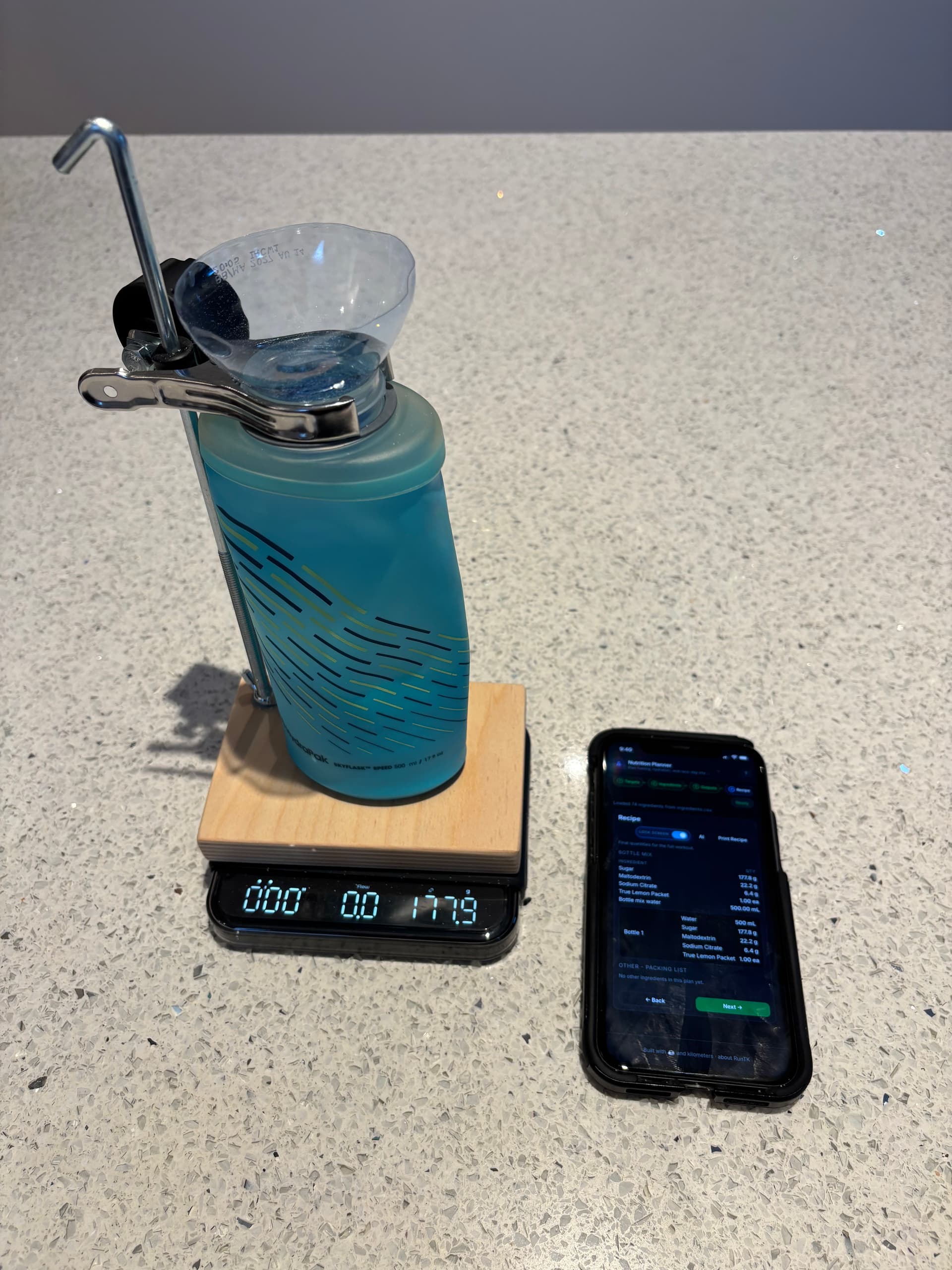 It’s just a clamp mounted on a piece of plywood that holds the soft flask upright on my coffee scale. Pop a funnel on top and I can weigh out each ingredient precisely without the flask tipping over or needing a third hand. Pull up the recipe on my phone, go down the list, tare between each ingredient, add water, and done.