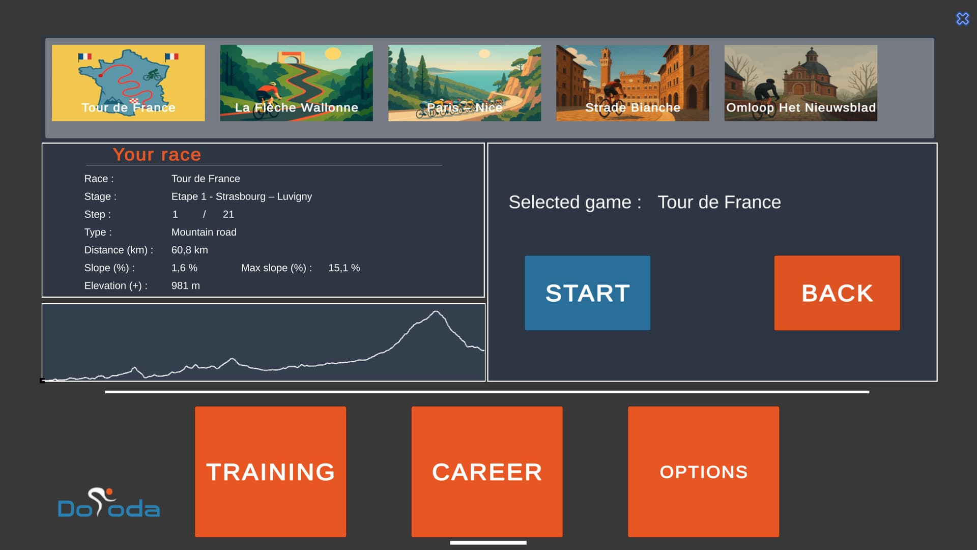 Dooda Cycling is a free Windows (64-bit) application that lets you train on your smart trainer with a realistic road simulation. Each route is reproduced meter by meter for maximum immersion.