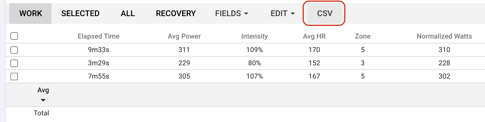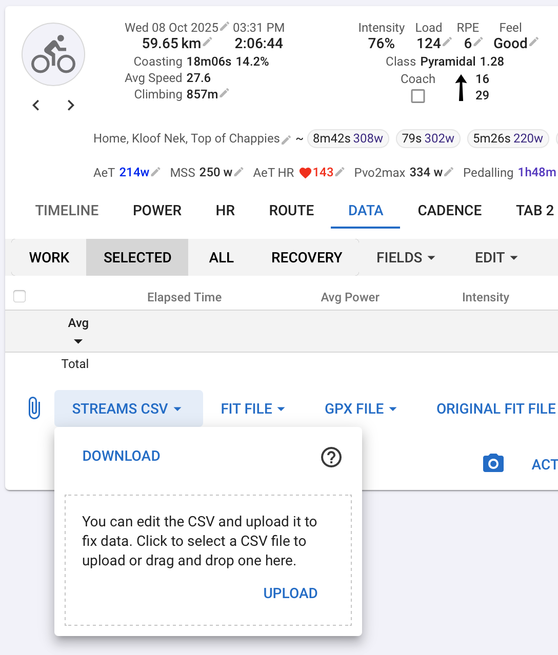 All Intervals.icu users can download a CSV of the streams (power, heart rate, cadence etc.) for an activity for analysis in Excel, Google Sheets etc., on the activity data tab. Supporters can also upload the CSV to add or edit data.
