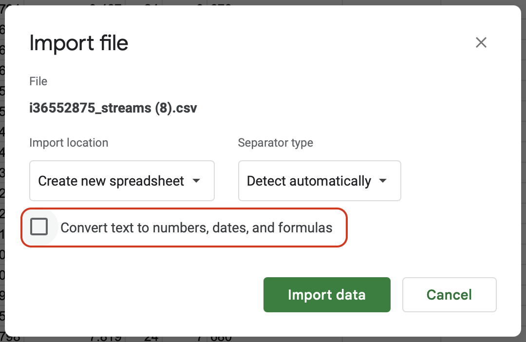 Once the data has loaded, select all the normal columns and do Format → Number and choose any number format. This will convert the text to numbers. Then do Format → Number and choose “Automatic” to restore automatic number formatting.