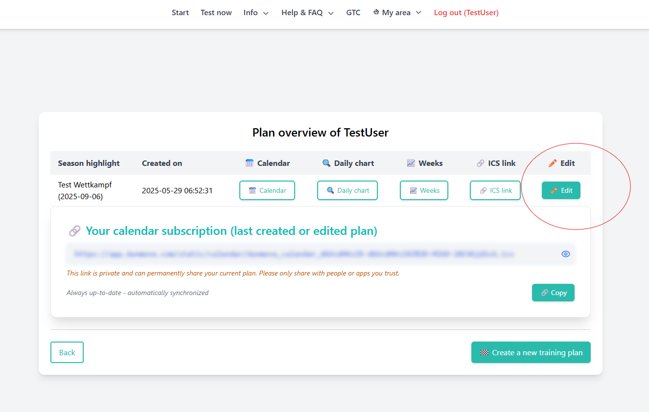 Edit function for existing training plans