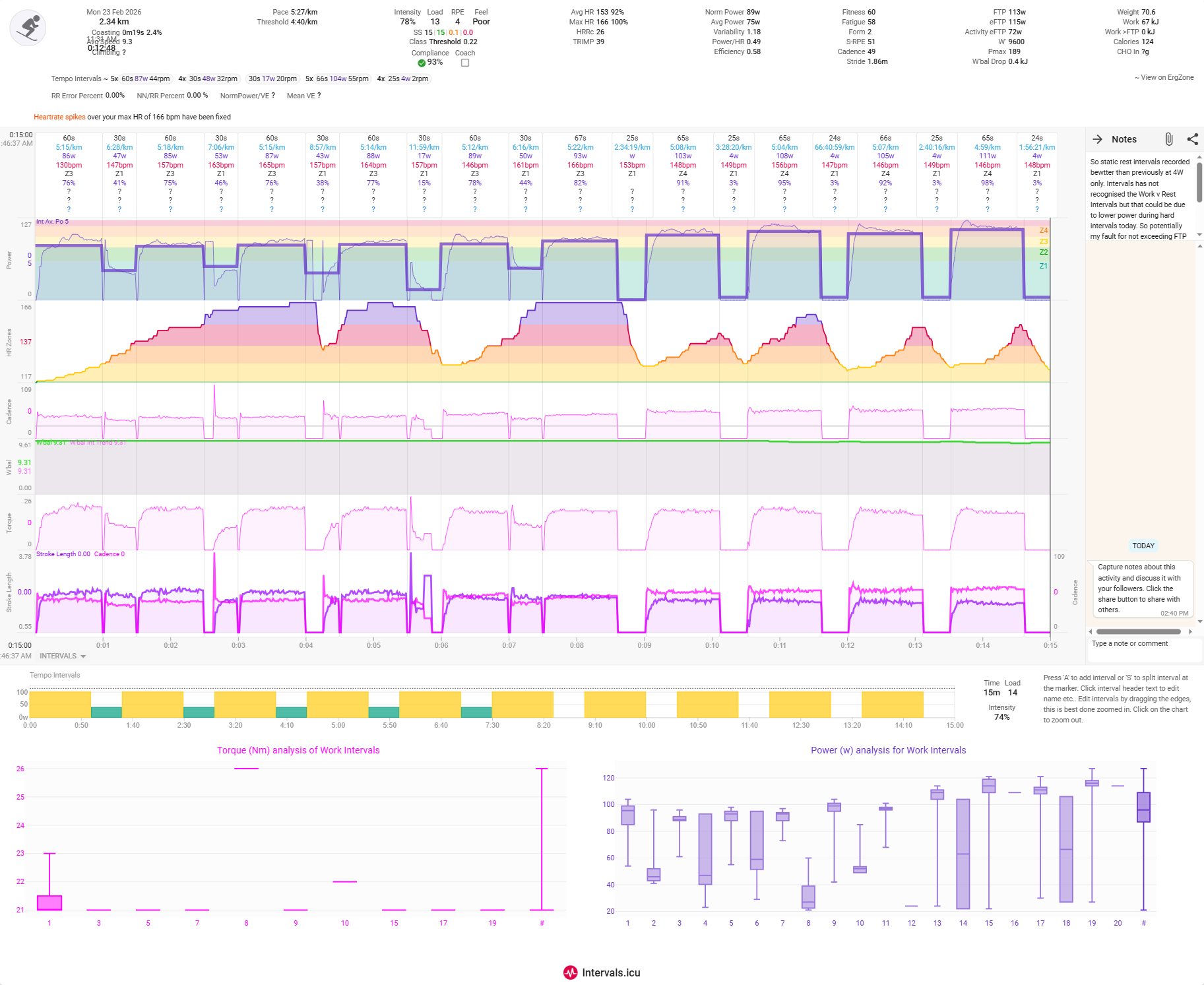 So static rest intervals recorded better than previously at 4W only. Intervals has not recognised the Work v Rest Intervals but that could be due to lower power during hard intervals today. So potentially my fault for not exceeding FTP perhaps or polarising the efforts sufficiently? Cadence irregularities was my fault as my phone slipped in its holder & it pressed power button. So I had to stop twice to reset it.