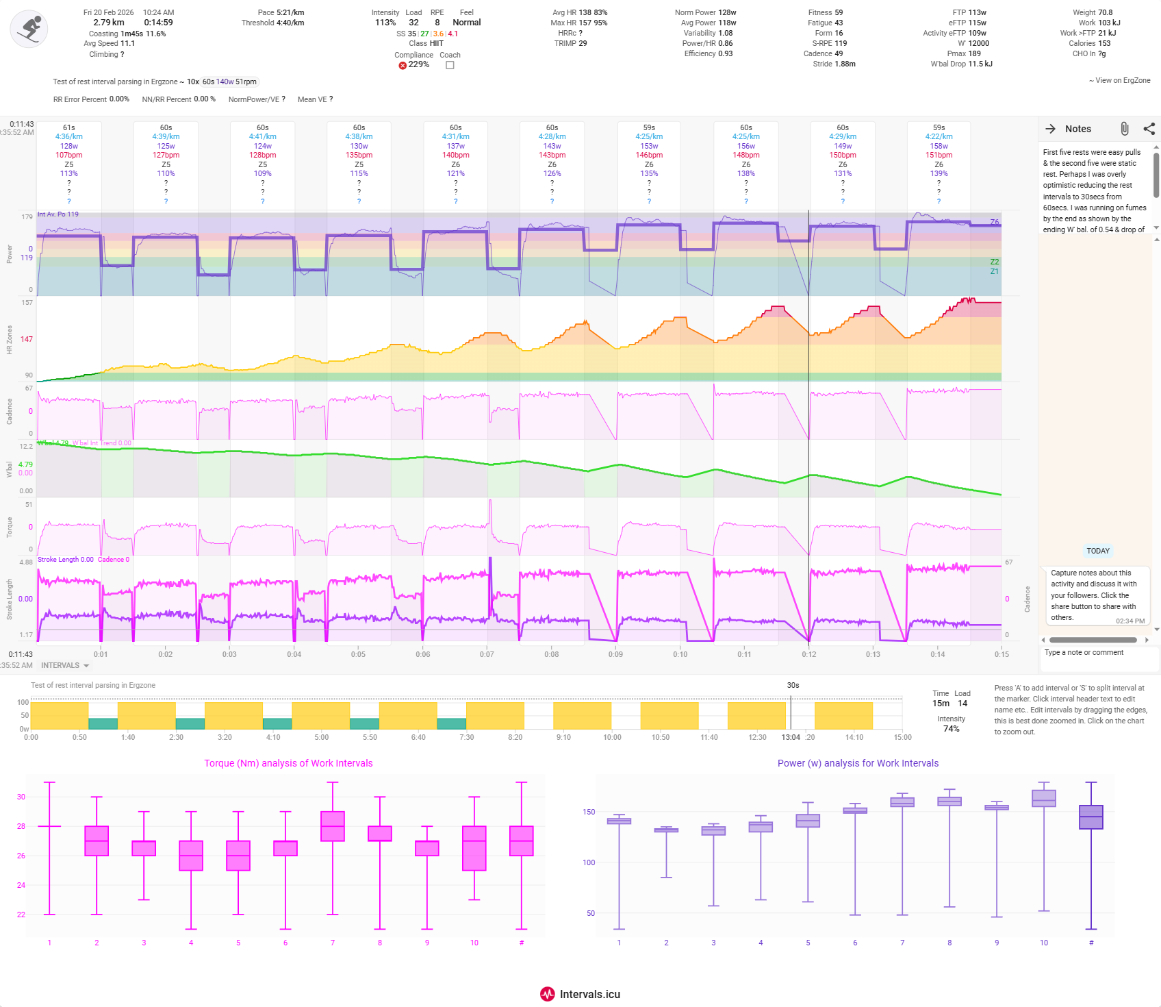 @greis I have adjusted the intervals based on cadence dropoff rather than power & so now have got the static rest intervals’ power down somewhat but at the expense of making the interval duration inaccurate. So ultimately the recorded power will not be accurate/over estimated as I was not actually pulling hard for 87s in intervals 6-9. I stuck rigidly to 60s for each hard interval.