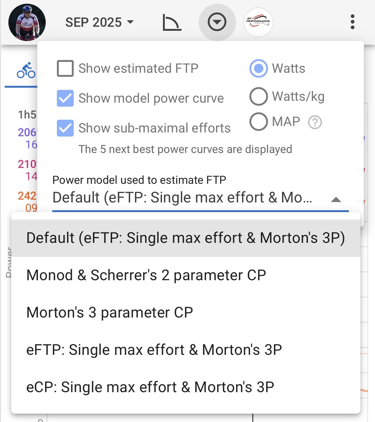 After a test on 8/5 where I got 992 seconds at 316 Watts Intervals.icu gave eFTP of 296 using the Default Single Max effort and Morton 3P. Highnorth Gave CP 301 FTP 289 Watts.