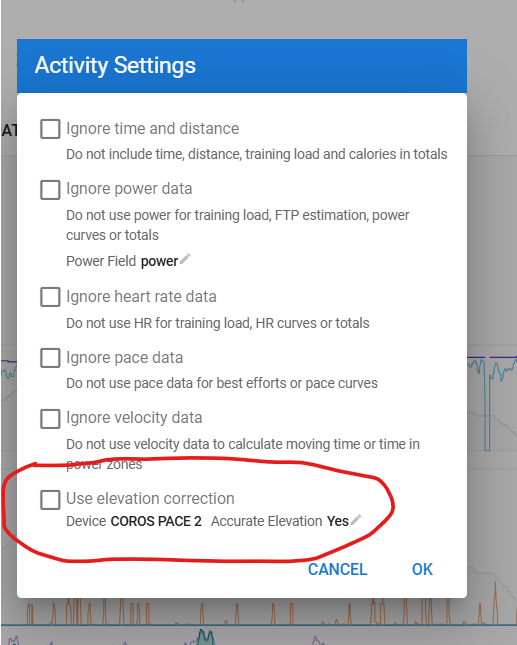 If you don’t have a baro-sensor in your device, you can set to use elevation correction. Elevation is then queried from online maps. The quality of those maps depends on your region. The quality of the elevation from those maps depends on the quality of the GPS signal (and thus also on your device). A GPS signal that is low in quality will put you ‘next’ to the road your following iso on the road. That can cause huge errors when travelling mountainous areas. City courses can also give errors caused by bridges and tunnels.