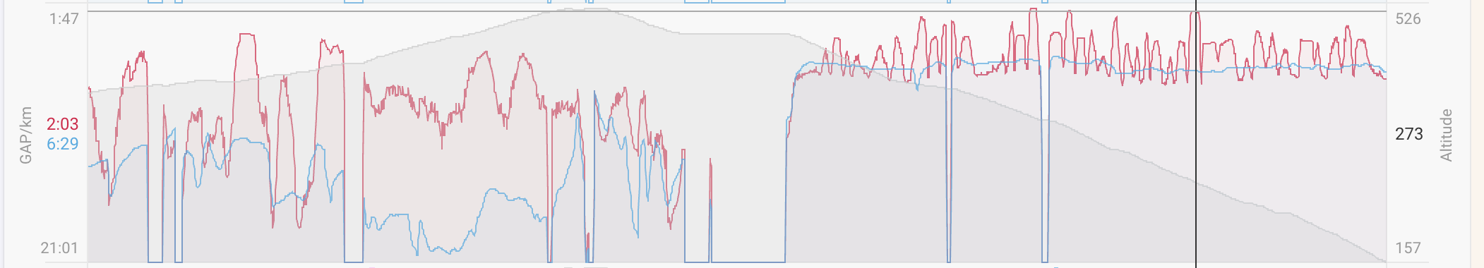 In a recent trail run the GAP calculation is off by a lot. Especially on a descent section where I was running at constant pace, it jumps up and down and shows paces completely unrelated to my actual effort. Below is a chart showing altitude, pace (blue) and GAP (red) of my run: