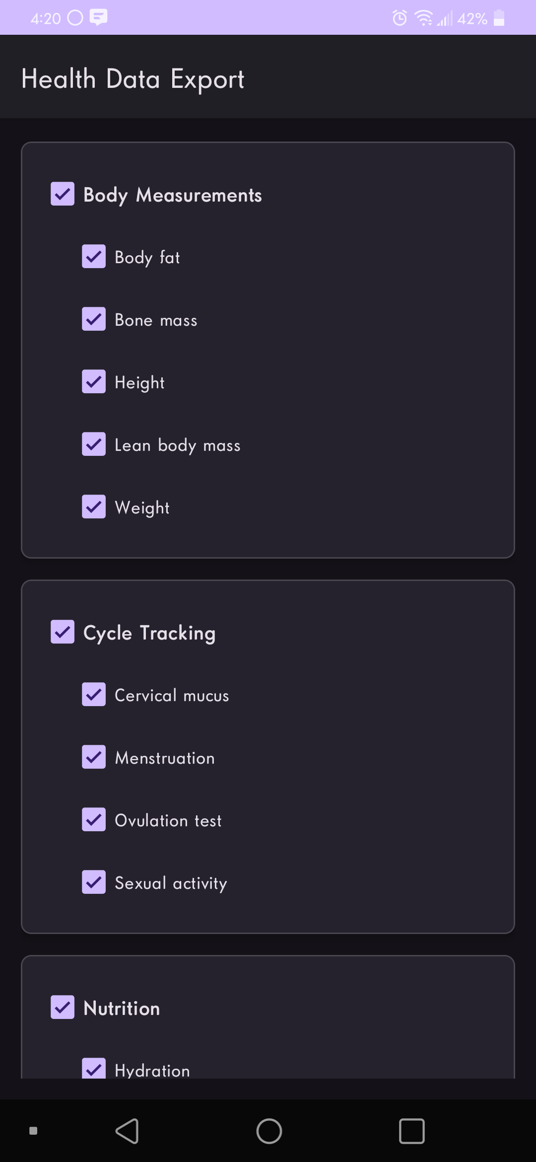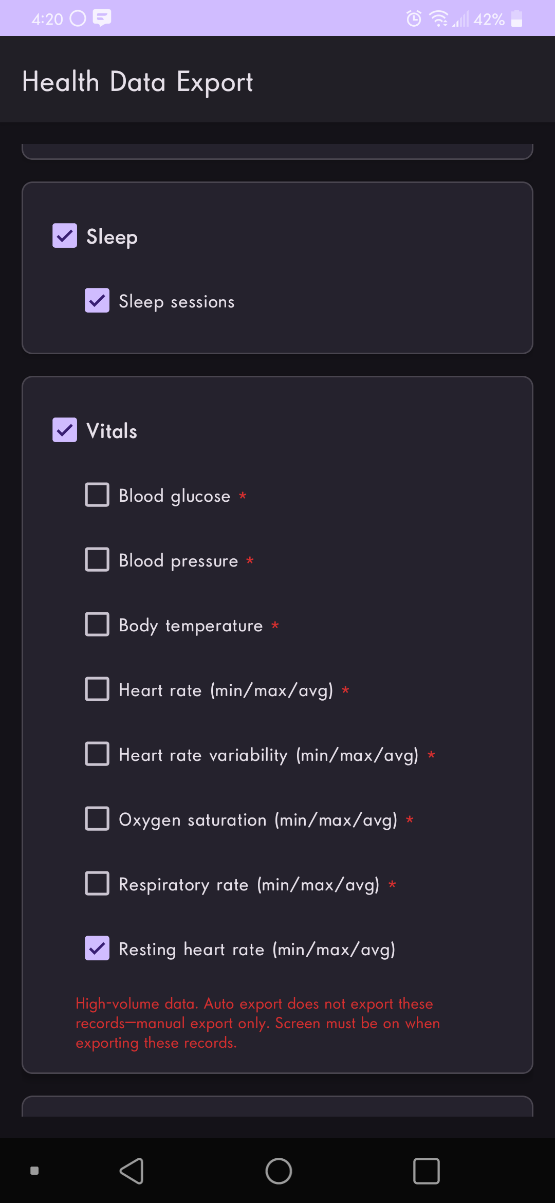 Since it integrates with Health Connect, it can read and export data from virtually all wearables! It supports per-day exports across categories like Activity, Body Measurements, Sleep, Nutrition, Cycle Tracking, and Vitals (including high-volume metrics like heart rate / HRV / SpO2 / respiratory rate).