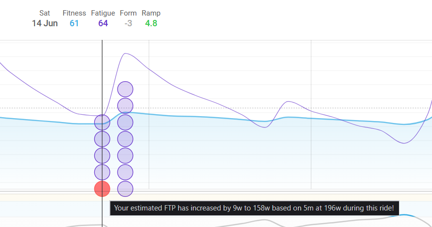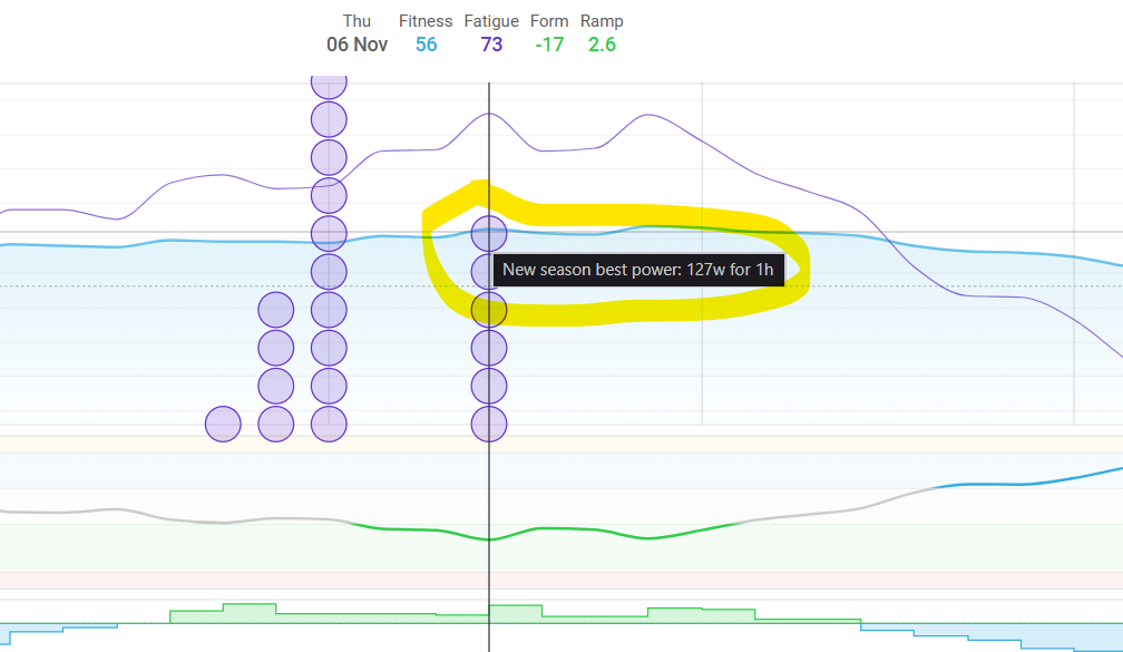 Set the date-range to last month or something like that and you will see the purple dot on the fitness chart in a more friendly way.