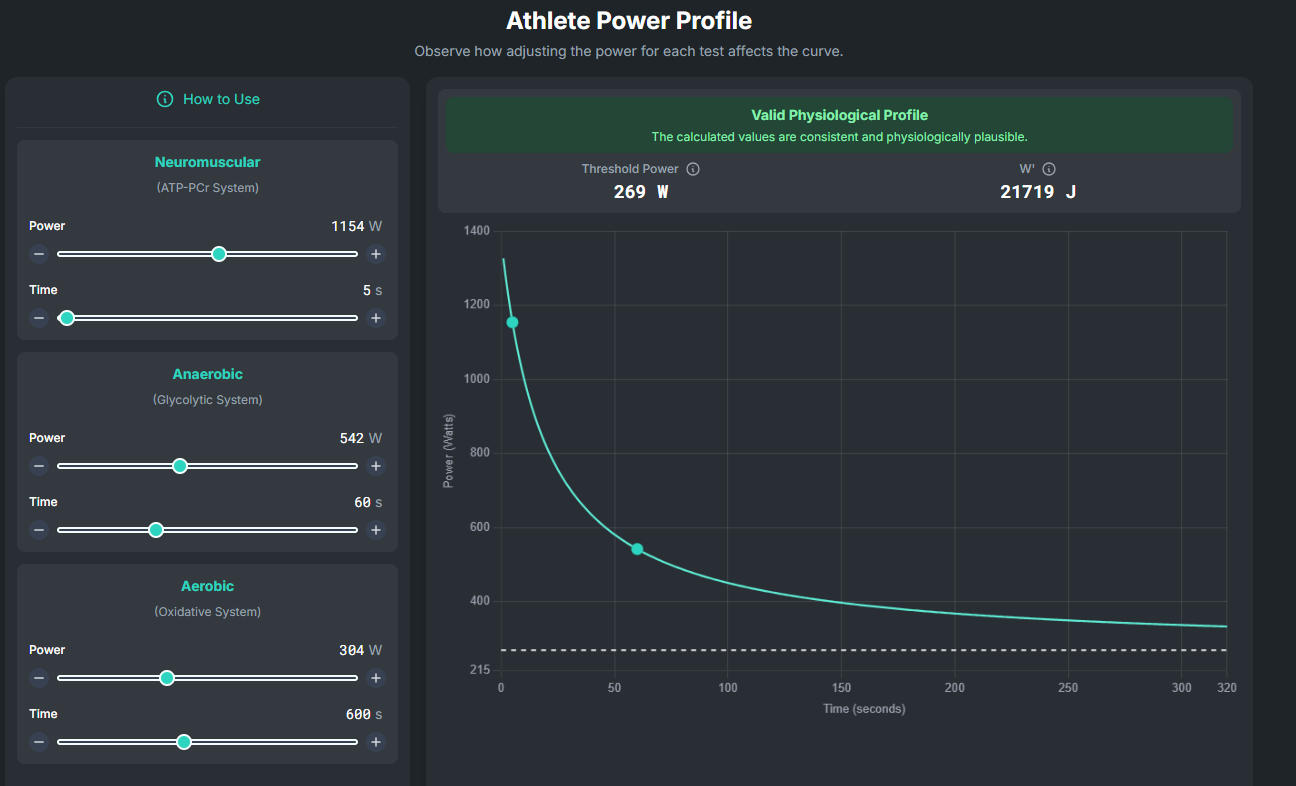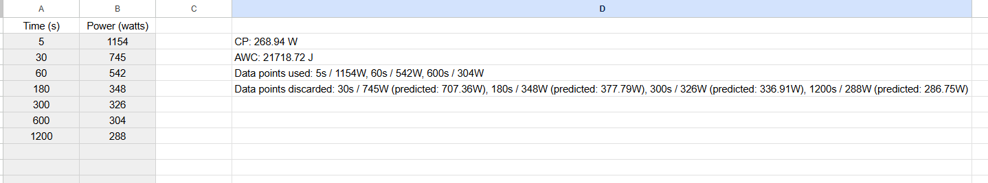 As this is my first experience creating something with programming, I kept it quite simple. The idea is just to input the data and analyze the impact on the CP and W’ estimations. Individually, the user and perhaps the coach can assess whether the estimation makes sense and suspect if any of the efforts were submaximal or not. But I agree it makes sense for the user to evaluate information like RPE, nutrition, and prior fatigue when analyzing what they demonstrated in the test. Just like most tools, it shouldn’t be used blindly.