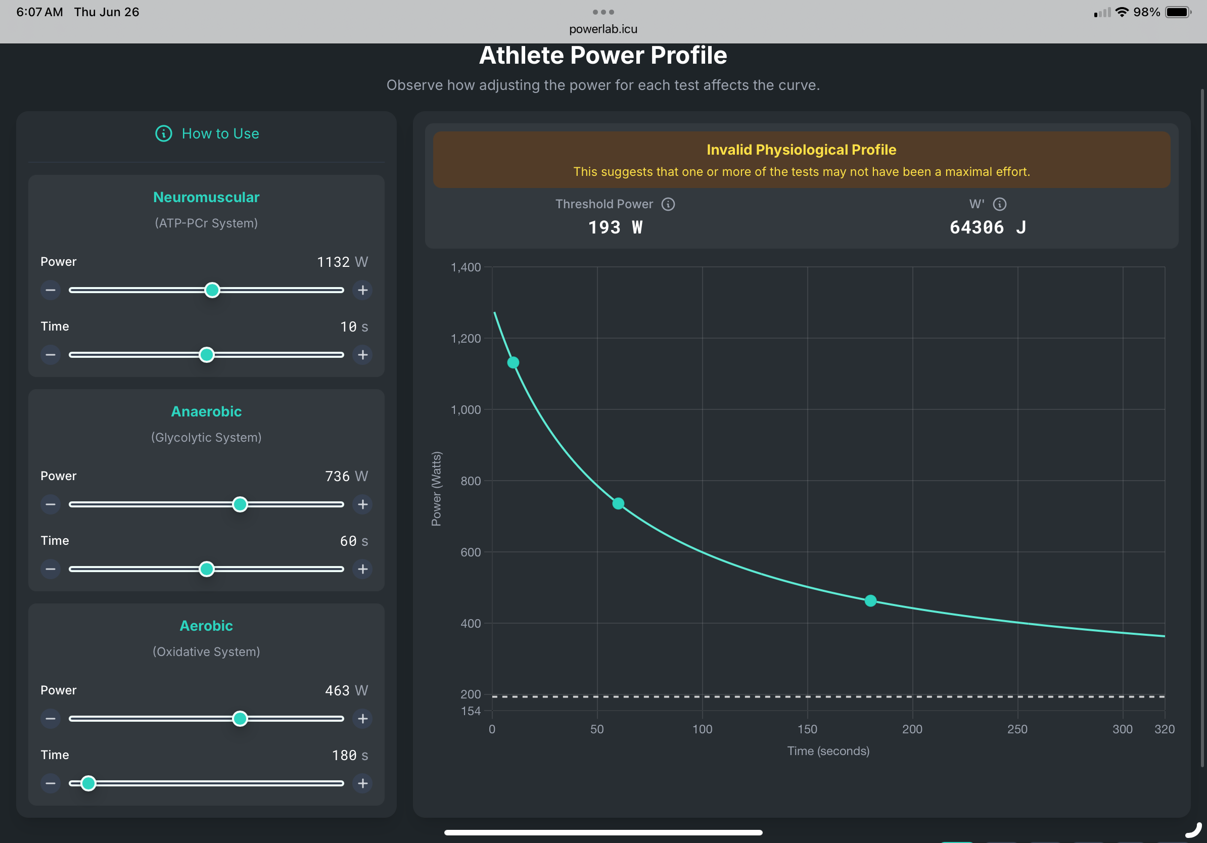 IDK. I plugged in my numbers YTD and get the same error. I’ve done plenty of all out 3 min efforts. Perhaps I’m awful at 3 min intervals, but don’t think the numbers are invalid.