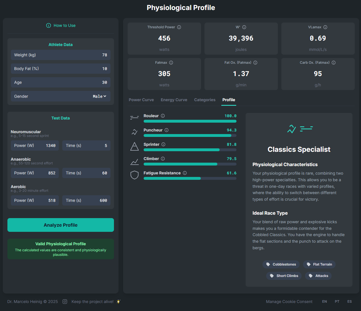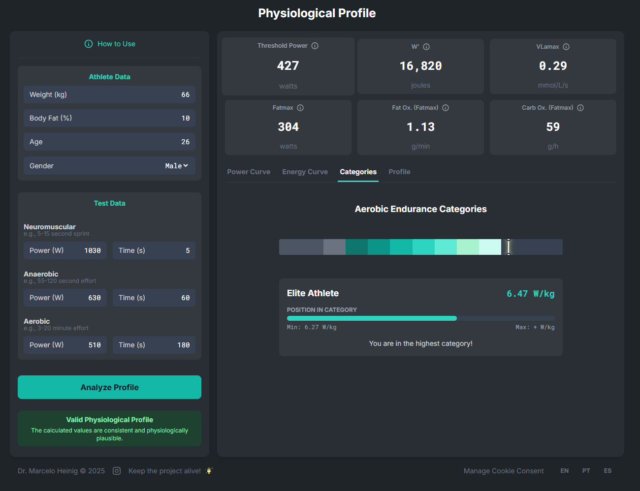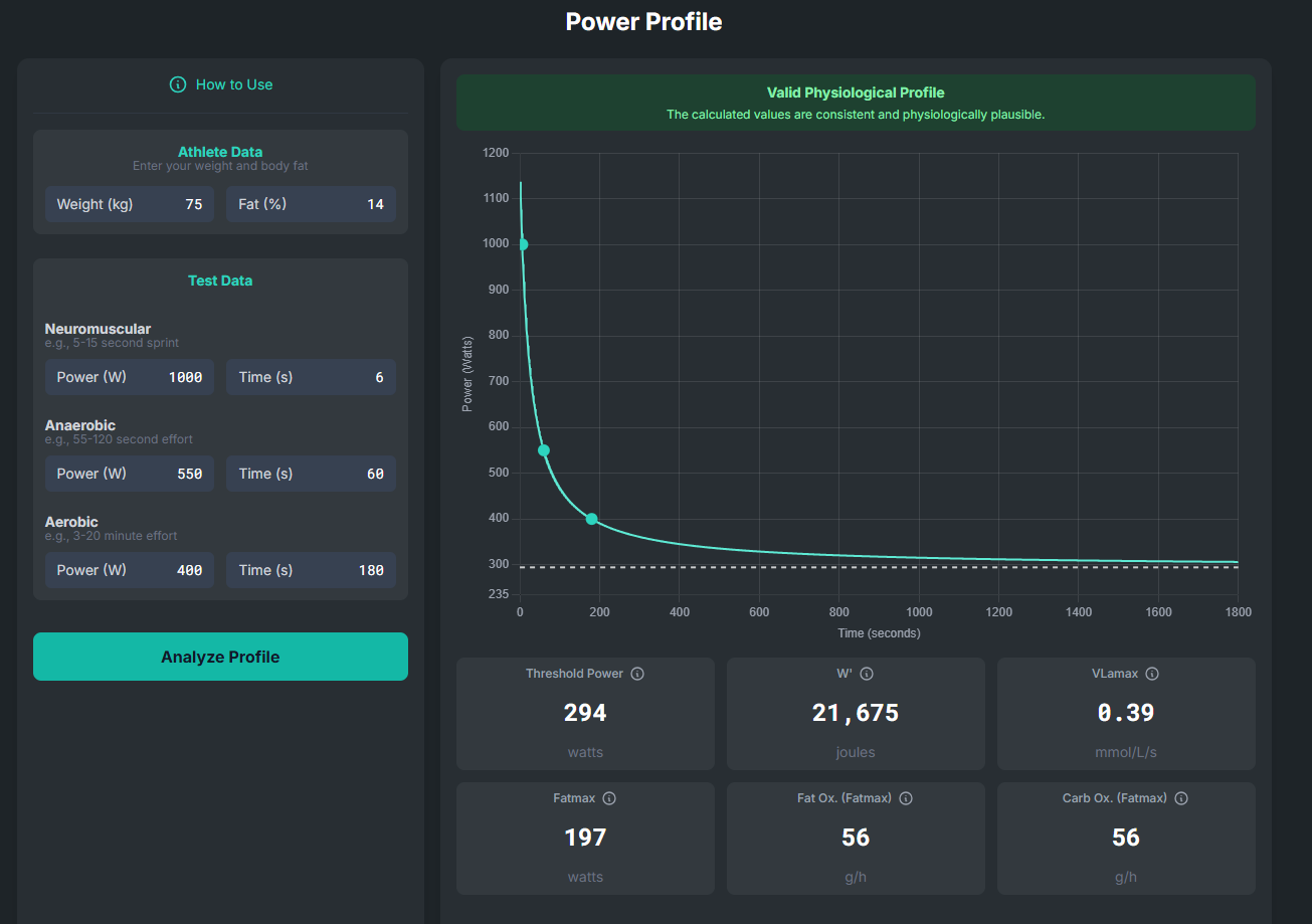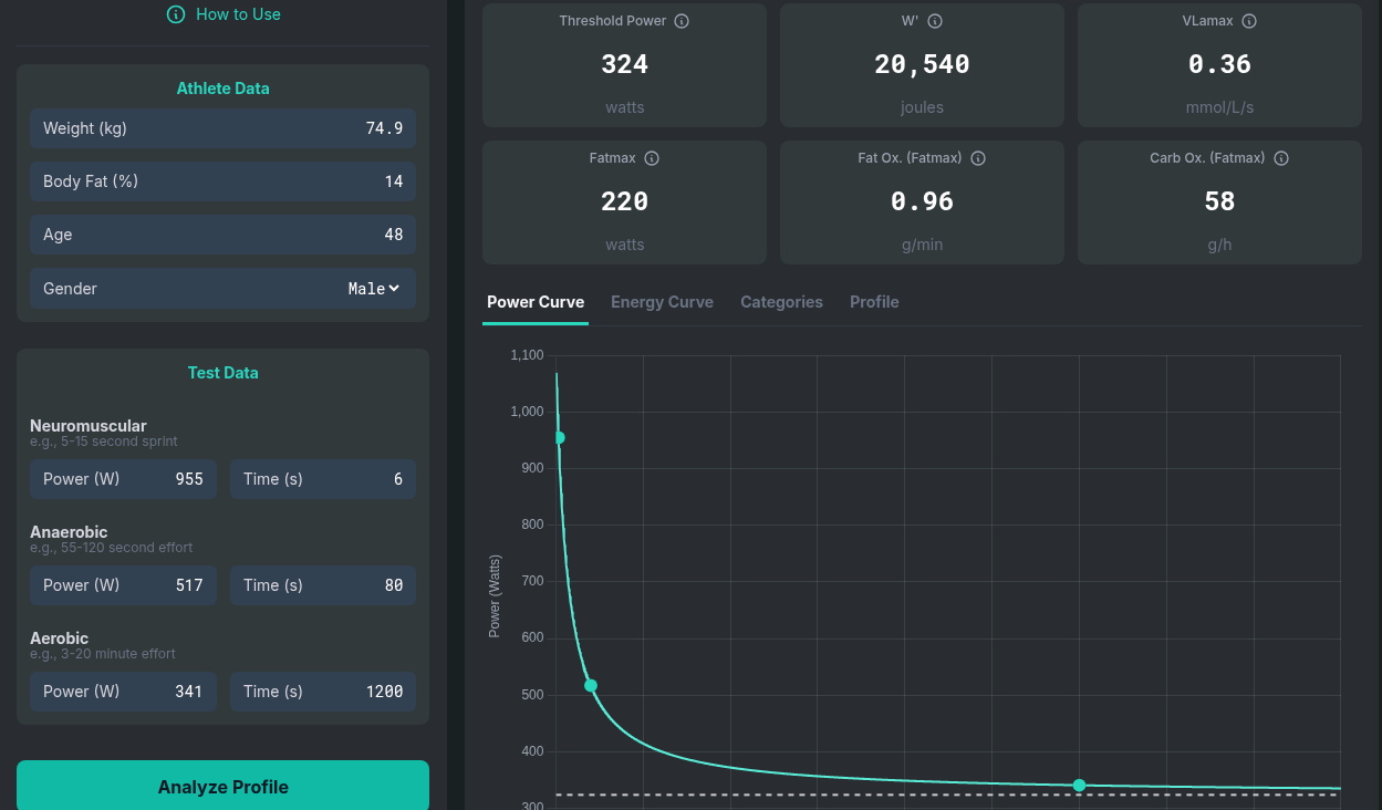 Furthermore, I recently compared the calculations from powerlab.icu for an athlete with the profile below with a German platform.