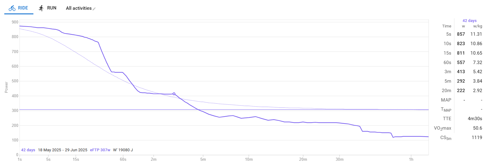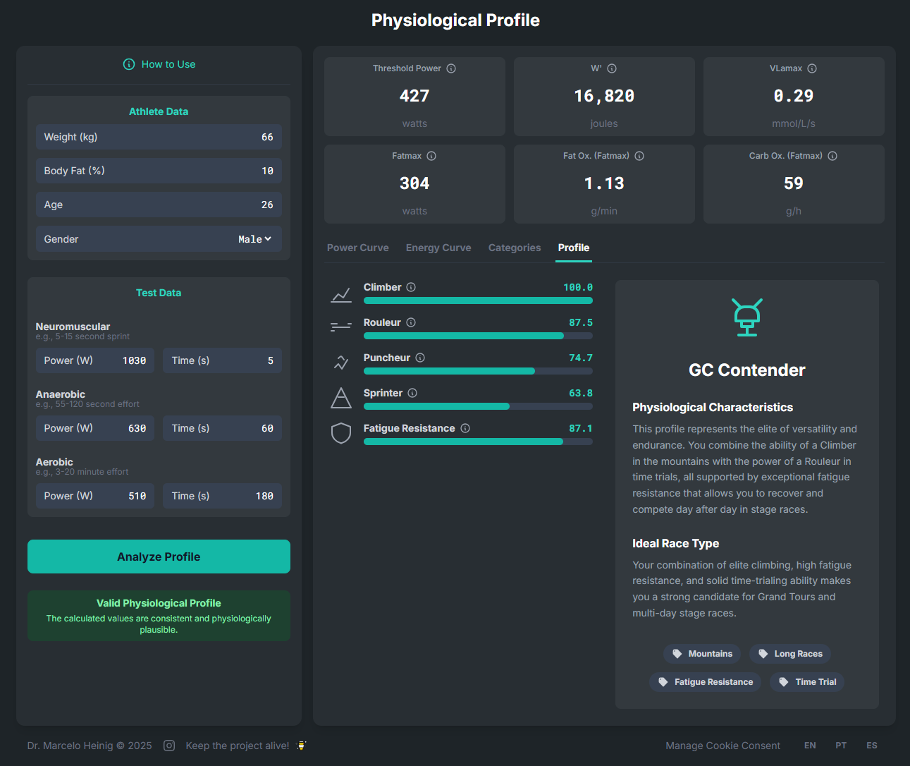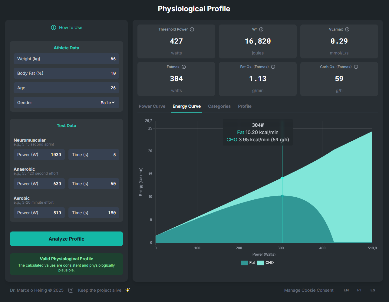 It’s difficult to compare without knowing how other platforms perform the calculations, but (in my opinion)… a VLamax of 0.25 mmol/L/s makes no sense for a 54-year-old man who generates 637 watts in 60 seconds. He is clearly glycolytic. Where does the energy to generate those watts come from if not from glycolysis in 60 seconds? Interestingly, the athlete underwent a calorimetry test that had already shown high carbohydrate oxidation at rest and at low intensities.
