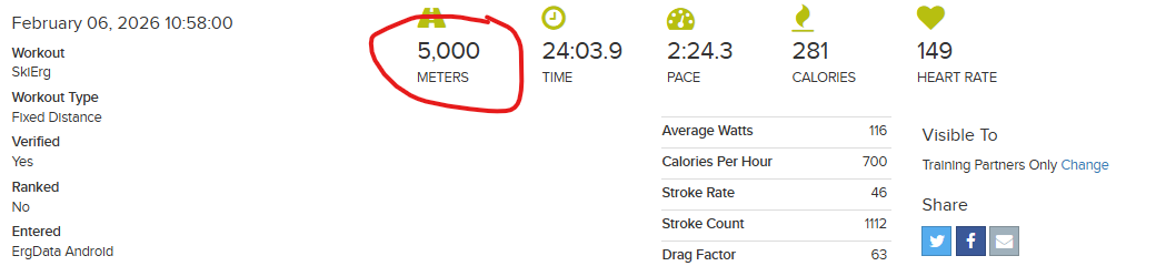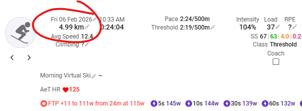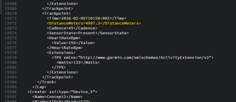I’m seeing workouts come in slightly short — for example a 5,000 m effort is imported as 4.99 km — which means those efforts don’t register correctly as best efforts. It looks like the rounding logic for the final few seconds of a 3‑second‑resolution C2 file might be the cause.