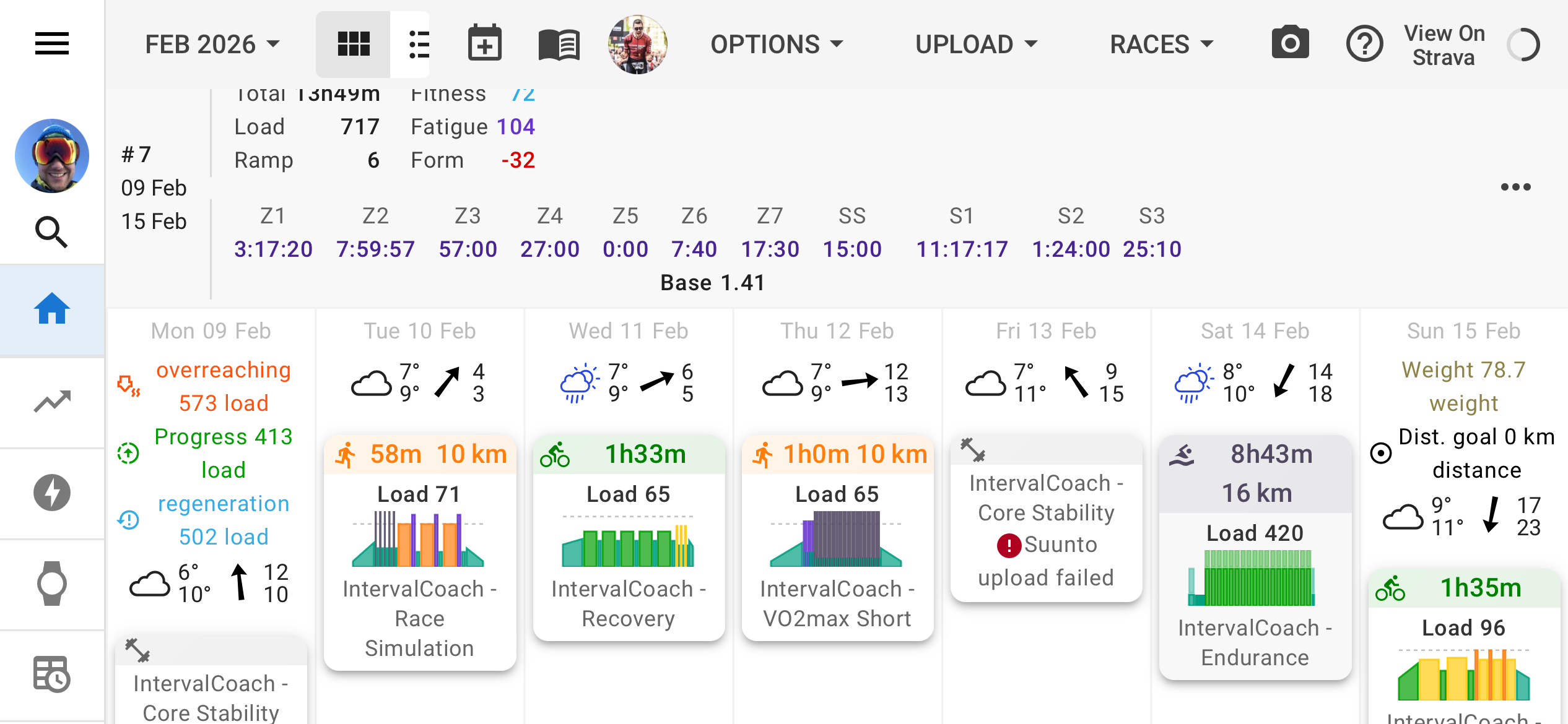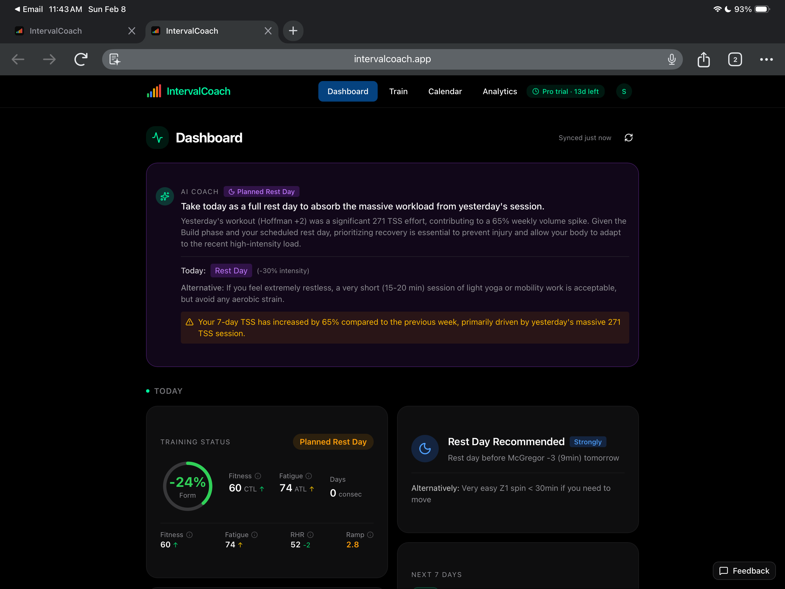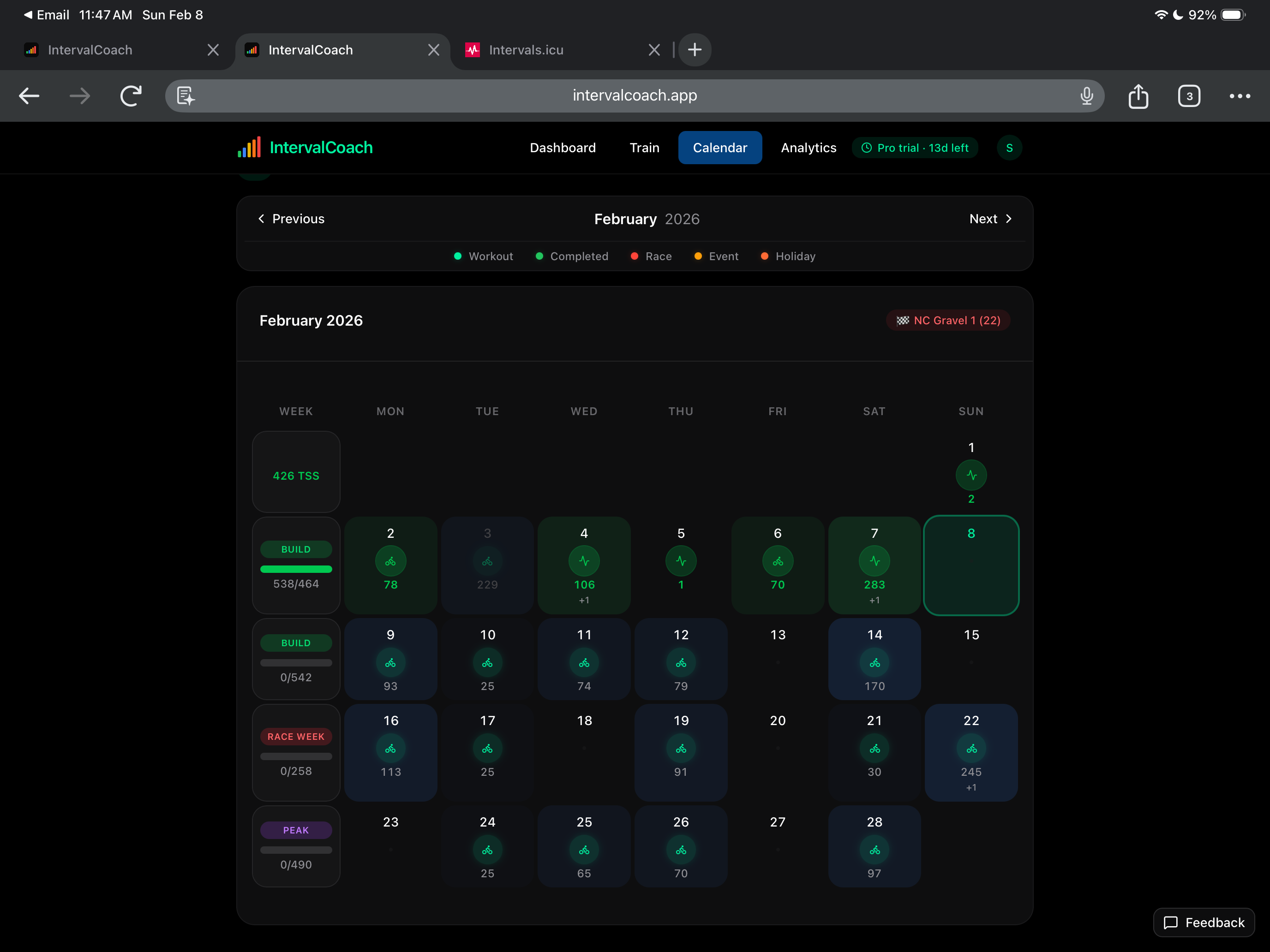 For the recent activities: the dashboard and calendar data is cached and refreshes when you load the page. After a Zwift workout syncs to Intervals.icu, there can be a short delay before it shows up. The analysis email fires faster because that’s triggered directly by the webhook. If you do a hard refresh on the dashboard it should pick up the new activity. If it still doesn’t show after a few minutes, let me know and I’ll dig deeper.