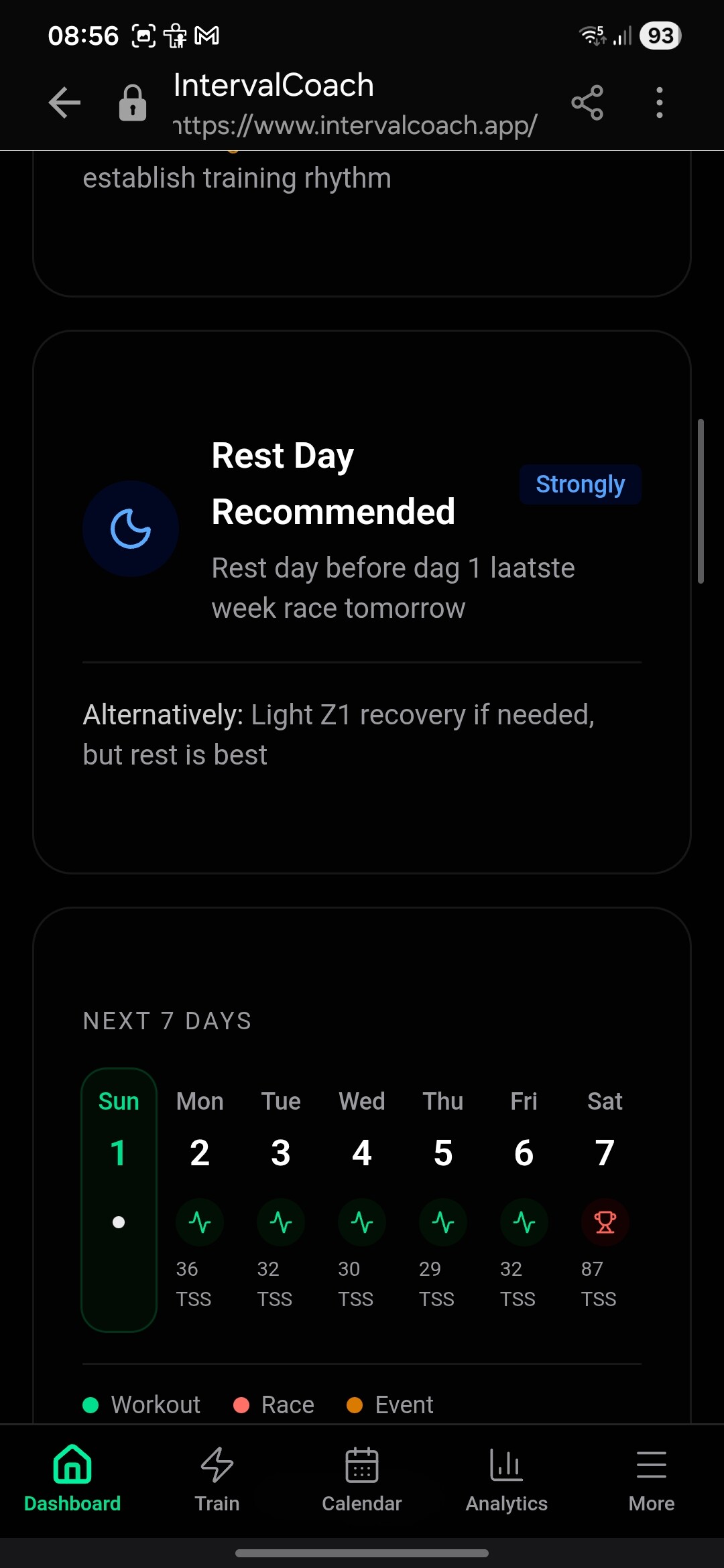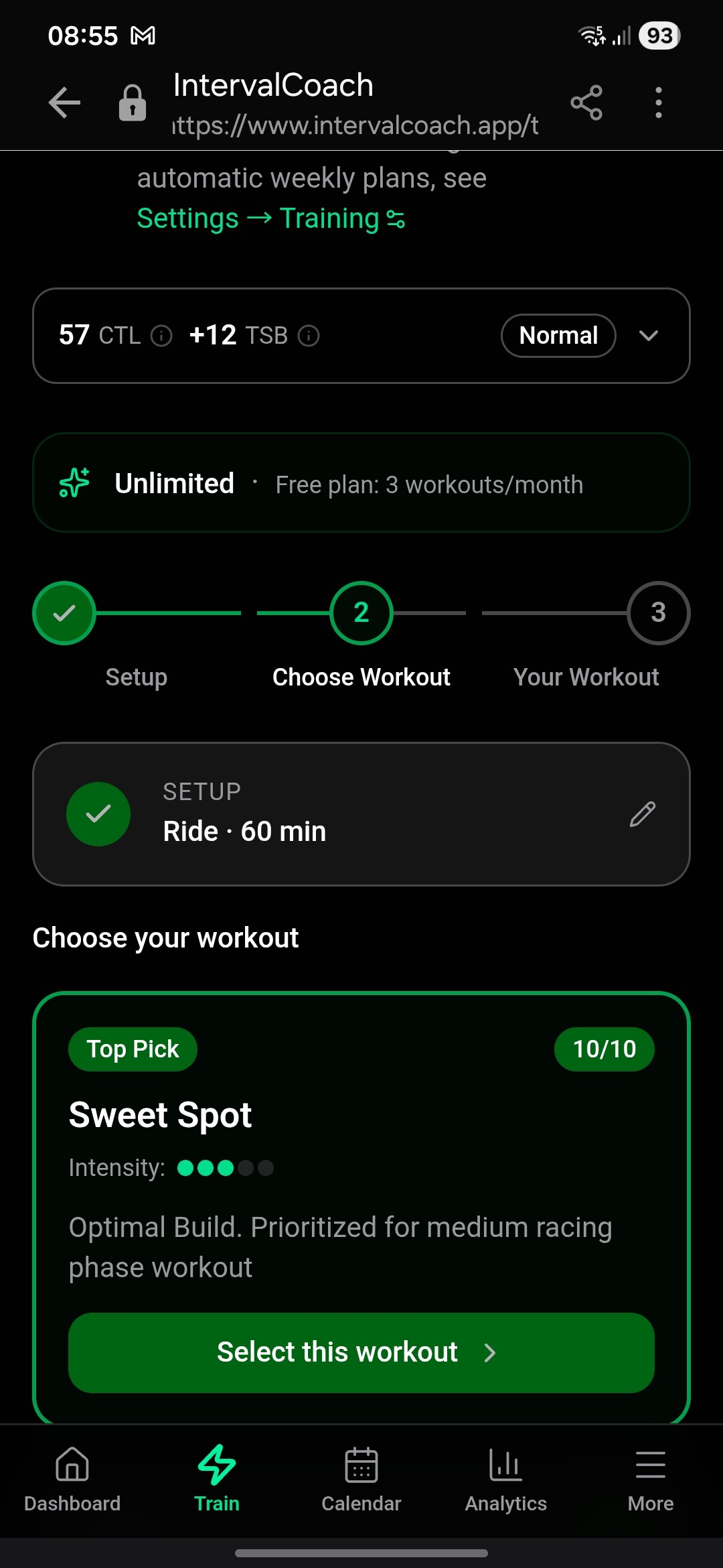 JustTrain showing Sweet Spot on a rest day: This is a known issue. The dashboard correctly recommends rest, but JustTrain still shows intensity workouts as top options. The workout selection doesn’t filter based on whether it’s a scheduled rest day. This is already on my list to fix, and upping priority to fix it properly.