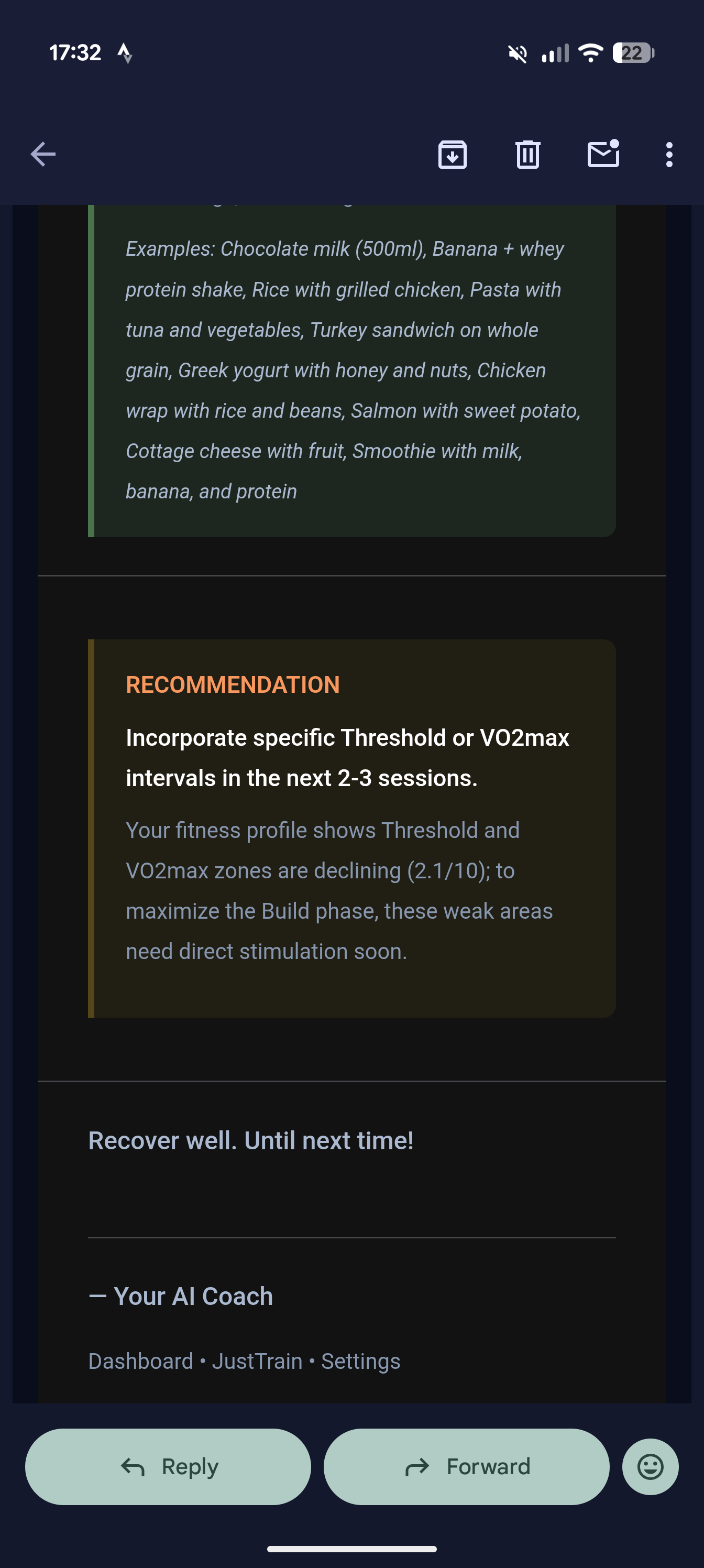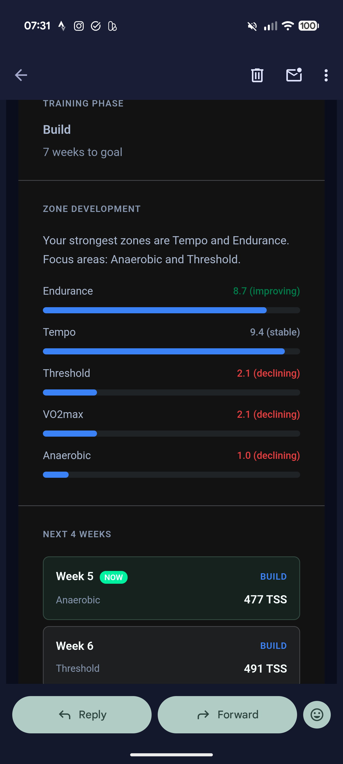 4-week outlook showing “Build” for race week: This is a bug. You have an A-race this weekend, and the outlook should show “Race Week” with reduced volume, not “Build” with 470 TSS. The dashboard gets it right (hence the rest day recommendation), but the weekly email outlook isn’t picking up your race event. I’ve logged this as high priority.