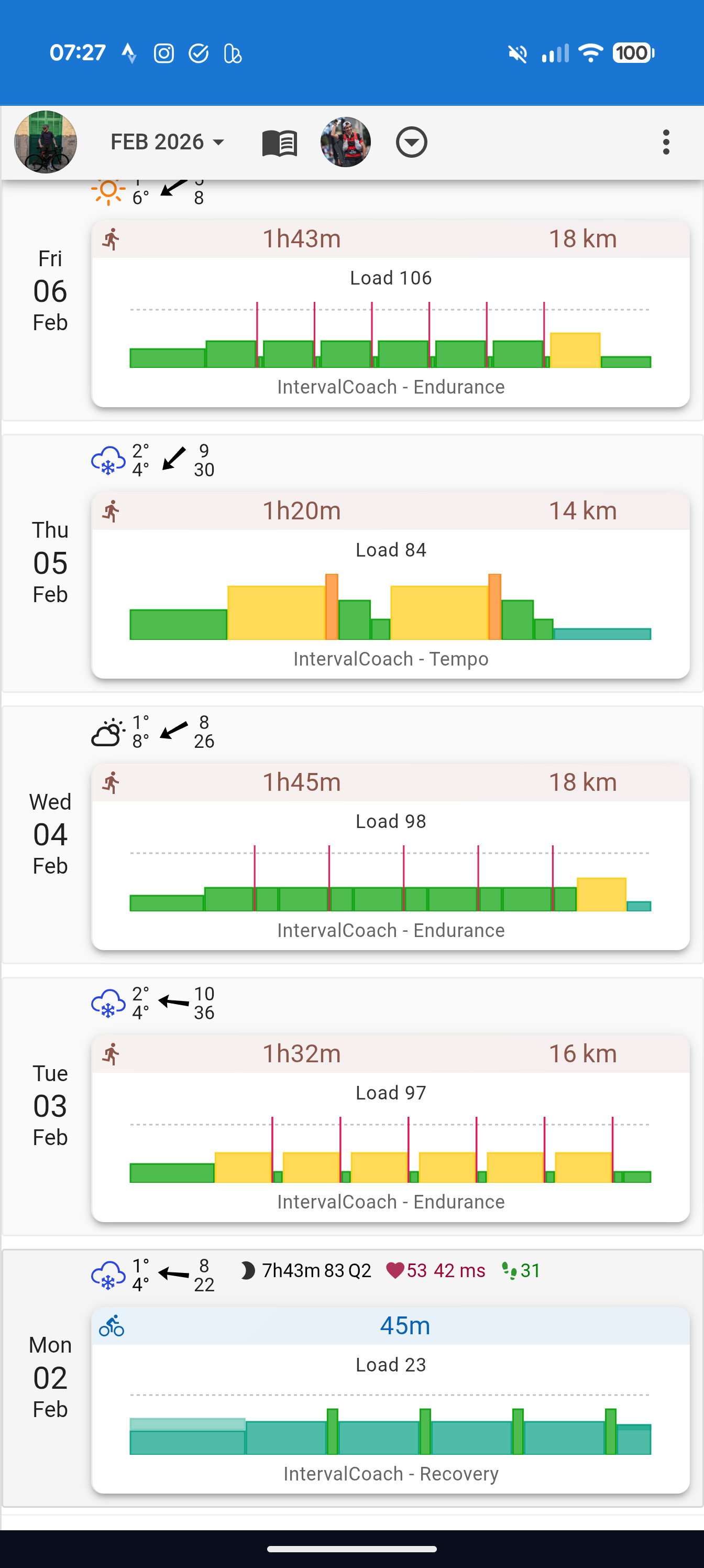 Thanks for the screenshots, that made it easy to track down. The weekly plan starts counting from today and goes 7 days forward. Since it generates on Sunday evening, the range covers Sunday through Saturday (Feb 1-7). That means the Sunday workout lands on today (Feb 1) instead of next Sunday (Feb 8), which is where it should be.