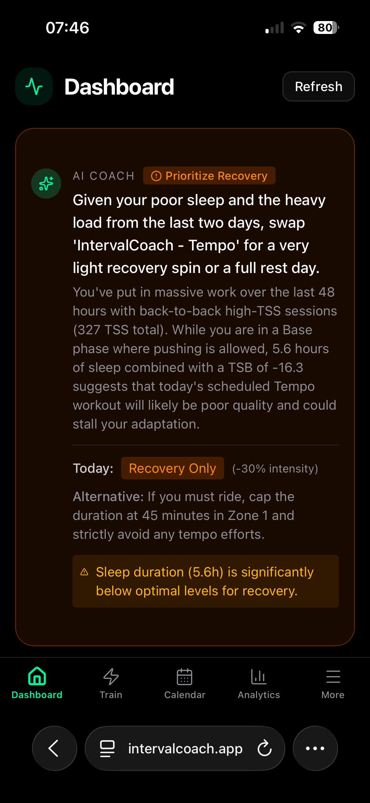 - The AI Coach insight on your dashboard looks at your current state (TSB, recovery) and gives recommendations