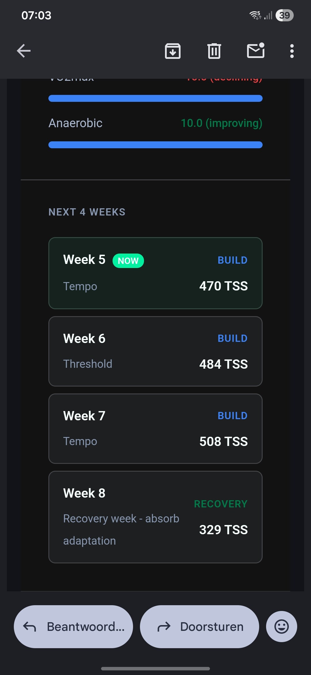 Yet, in the e-mail it gives me an outlook of building with 470TSS in a A-categorie race week. And a build phase.