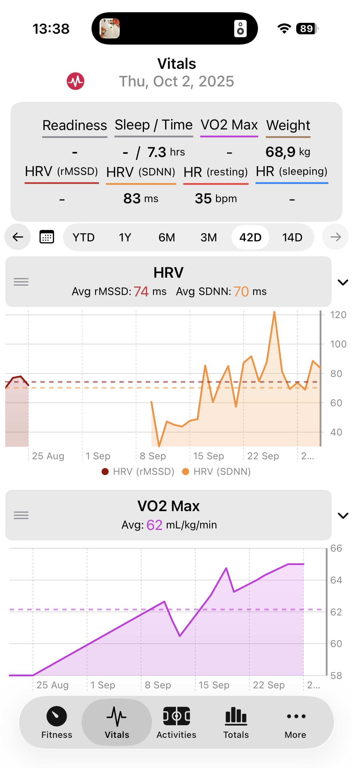 I stand corrected… Vo2Max is in intervals.icu, but not in companion app.I also miss sleep score? There is a field at the top of Vitals screen that says “Sleep/Time”. Time is there, but the “Sleep” field is missing… I am guessing this should be some kind of score? Also the HRV (rmssd) is empty, where should this be pulled from? My HRV4Training app?