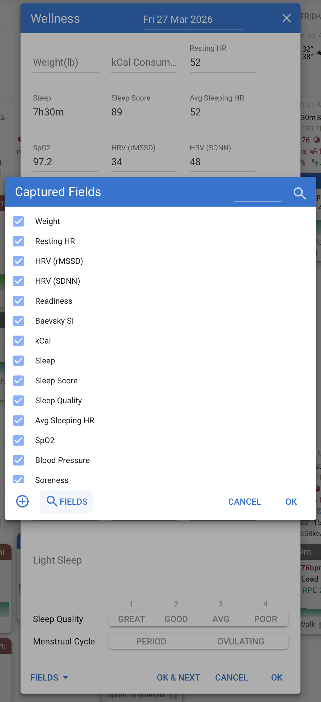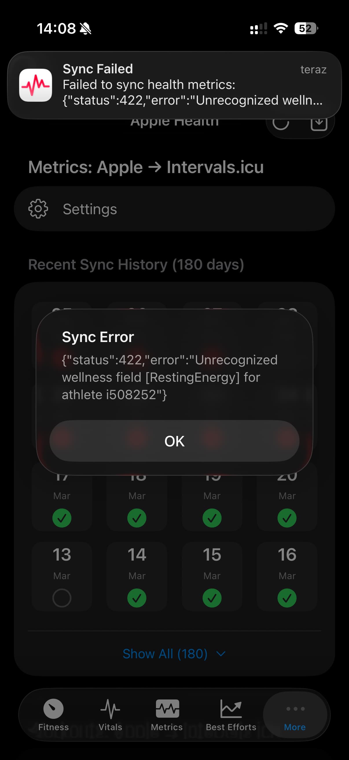Looks like you have the Resting Energy field enabled in the app sync settings. For this to work you need to create the custom field on the intervals.icu side. So you either need to do that or disable the field. There’s a note about this on the fields config screen below the Custom Wellness Fields section.
