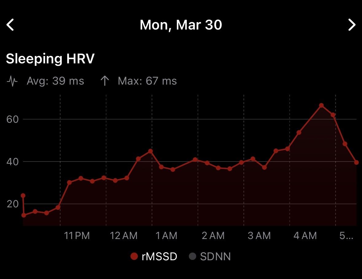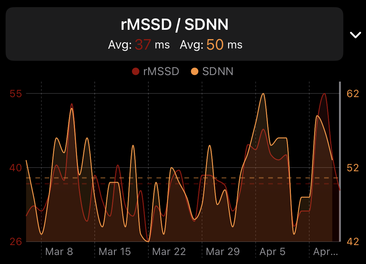 I also noticed Apple’s daily SDNN measurements follow the trends of my overnight rMSSD calculations pretty closely. Using the AF trick captures a lot more SDNN values as well: