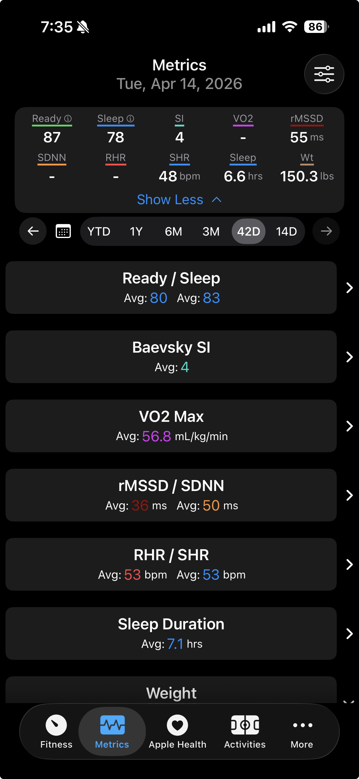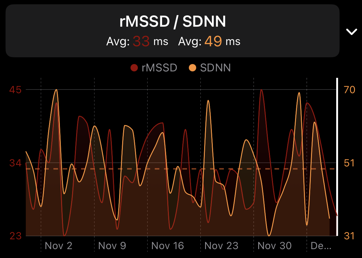 And here is what my rMSSD looked like when Oura was capturing it compared to Apple’s daily SDNN values (with AF disabled) synced by HealthFit: