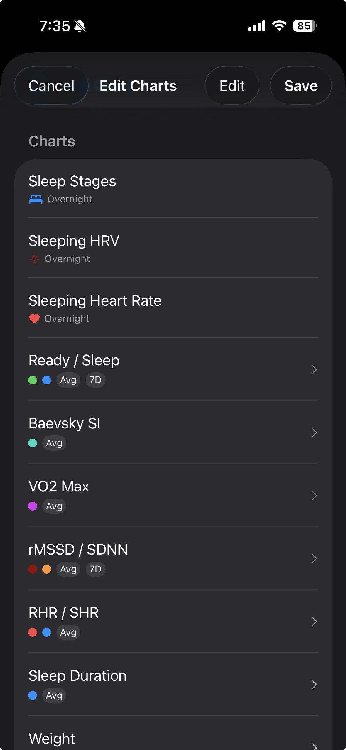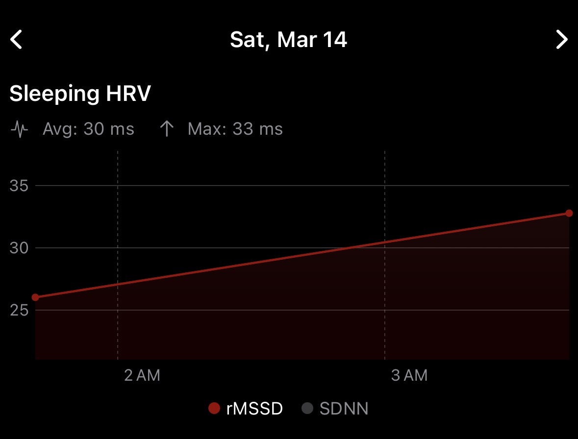 Another user helped with the Baevsky and overnight rMSSD formulas. These are calculated by the app using beat-to-beat measurement data during sleep periods. If you do the afib trick to make Apple Watch take more frequent measurements you’ll see a lot more HR sleeping data.