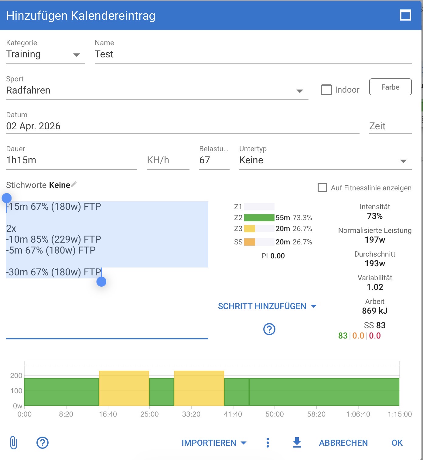 When I go to Workouts → Training Plan → “Test” workout on my Garmin device, the workout details are displayed. The following data is shown: